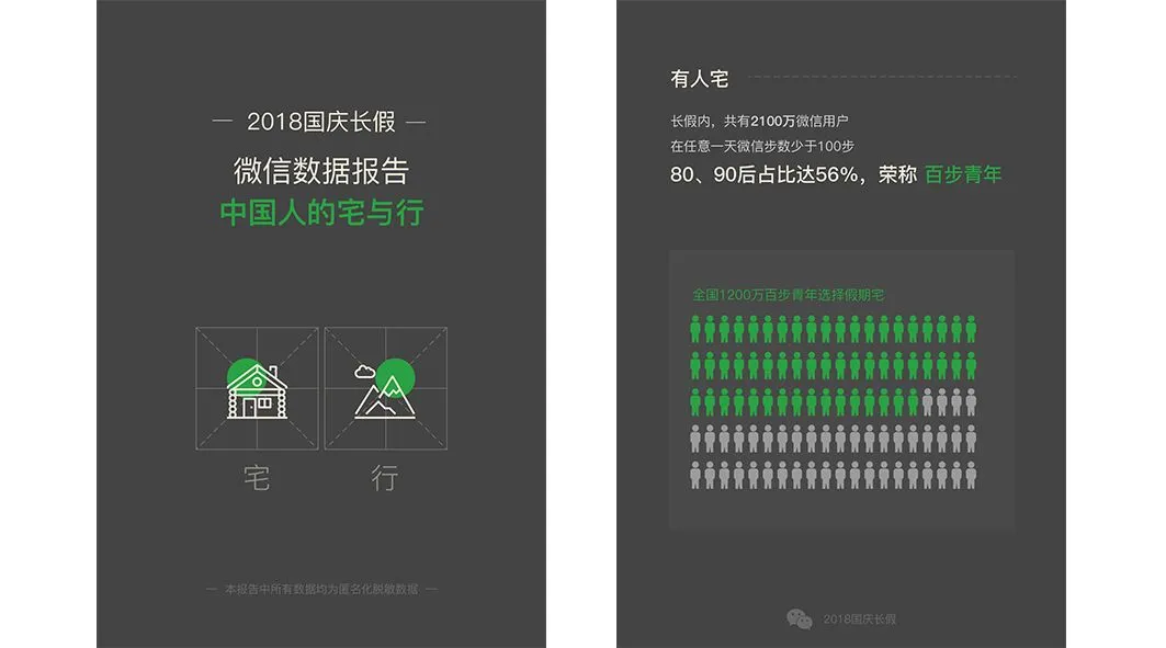 今日,微信发布《2018年国庆长假微信数据报告》,关注国庆期间中国人的宅与行。从9月30日到10月6日,全国共有2100万微信用户选择假期宅,他们的微信运动步数不满百步,其中,56%的用户为80后和90后的年轻人。除了宅,此次报告还从朋友圈签到、境外支付免单等方面展示了国庆期间微信用户的出行状况。