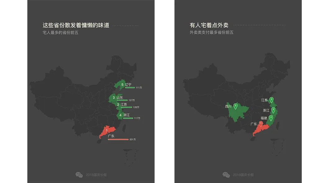 数据显示,宅人最多的广东省和江苏省,正是国庆期间外卖类支付最多的省份。除了外卖,微信还聚焦了更多宅着的生活方式。例如,读书。国庆期间,微信读书所有用户共阅读了1900多万小时,相当于2200多年时长。其中,阅读时间最长的用户阅读了84小时,平均每天有一半的时间都在“啃”书。