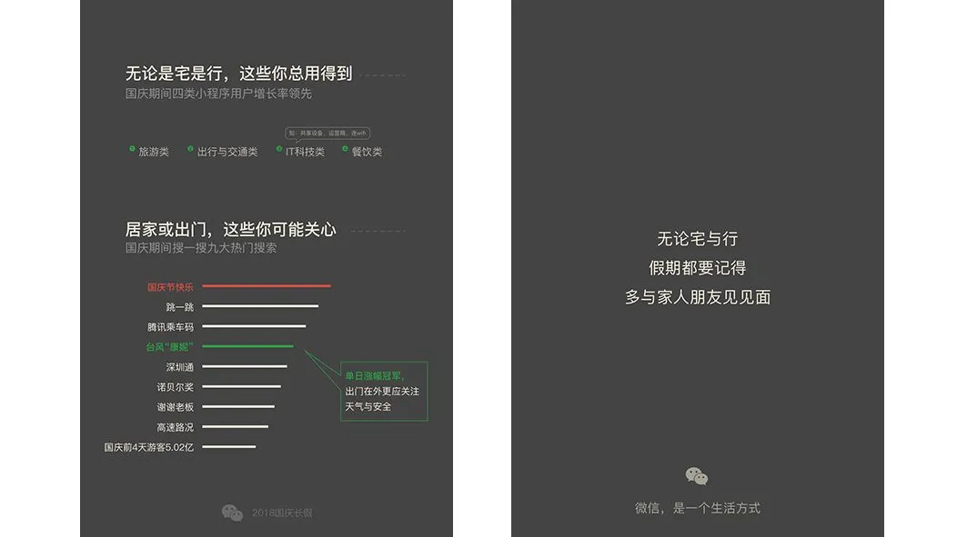 随着日活用户数达10.58亿,微信已经逐渐成为一个生活方式。微信支付、小程序、微信公众平台等能力为人们的生活提供了极大的便利,是出行、信息检索等众多场景下不可或缺的工具。国庆期间,旅行、出游和交通、IT科技和餐饮这四类小程序的用户增长率领先,腾讯乘车码、深圳通、台风“康妮”等话题在搜一搜热门搜索中的上榜,这些都十分符合人们国庆期间出行和休闲的应用场景。