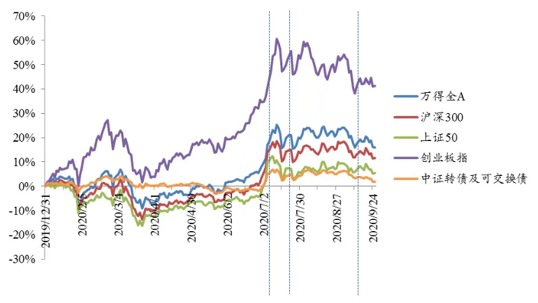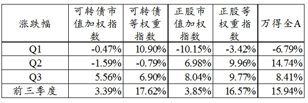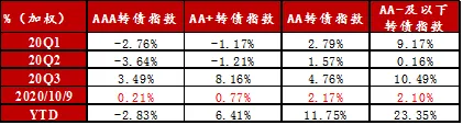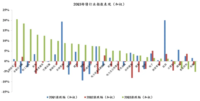 Q3表现较好的主要包括顺周期的可选消费、周期品、大金融板块,以及光伏新能源的装备制造板块,稳定板块也有较好表现,相对而言科技板块表现不佳。转债指数在国庆节后出现反弹,受益于“十四五”风光装机上修,装备制造板块转债延续强势。