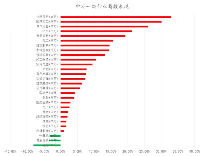 行业方面,除通信、商业贸易、计算机三个行业以外其他行业均录得正收益,行业涨幅分化较大,其中涨幅较大的为休闲服务、国防军工、电气设备、汽车等。年初以来,医药生物、农林牧渔两个行业连续三个季度实现正收益。