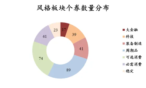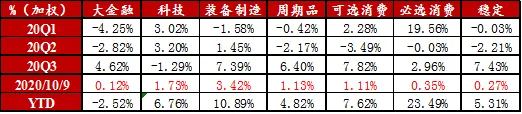 ❖ 2020Q2共发行可转债53只,合计发行规模约644亿元,相比Q1(48只/504亿元)维持增长,也大幅高于2019年同期水平(15只/88亿元)。同期赎回数量较多。❖ 截至三季度末,转债市场(含公募EB,不含定向可转债)存量券数量升至325只,市场总余额约5480亿元。❖ 按照余额统计,可转债存量个券主要分布在银行(29.2%↓)、公用事业(8%↑)、采掘(6.3%)、化工(5.6%)、钢铁(5.4%)等行业。❖ 从存量券的数量来看,化工、建筑装饰、医药、机械设备、轻工制造、汽车等行业的小转债数量较多。龙头标的的供给一定程度上弥补了赎回的影响。风格板块:金融、周期供给放量,优质大盘标的仍有稀缺性