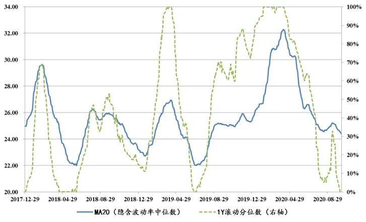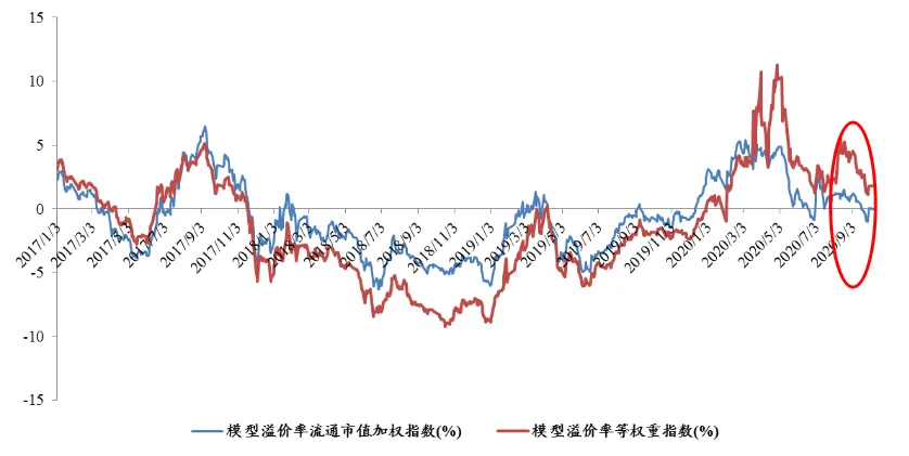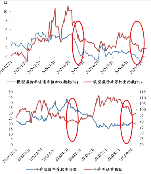 ❖当前转债价格1/4、2/4和3/4分位数为109元、117元和131元,分别位于2018年以来的78%、84%和89%分位,以及2020年以来的30%、44%和60%分位。整体看绝对价格相对于年内属于较低水平,由其是低价转债,但长周期维度仍然位于高位。❖偏高价格下,一是择券舒适度明显不足,二是对正股的beta效应增强,转债应对正股的波动缓冲效应减弱,投资上对风格和正股分析的准确性要求明显提高。当前有25%的个券到期收益率在1.1%以上,而3年国债收益率已上升至3.0%以上,纯债的相对性价比已明显回升; 6月底和9月底两轮杀估值下跌中,以中信和浦发为代表的偏债型银行转债YTM曾两度非常接近10Y国债收益率,但市场也立刻反弹进行纠正。考虑到股市相比债市胜率可能更高,从这个角度上看,逆向交易机会值得关注。❖当前全市场转股溢价率等权平均为19.26%,处于2018年以来12%分位,2020年以来28%分位;❖当前全市场转股价值等权平均为104.98元,处于2018年以来89%分位,2020年以来69%分位;转股价值不低,但对应转股溢价率估值中性偏低,反应的是对转股价值下行的担忧,即股市的不确定性加大。❖ 隐含波动率再一次见底,近期的行情中也没有显著回升,市场还略显谨慎;❖ 但目前看估值端显然很难有压力,当前更多强调机会;❖ 正股:6月下旬指数放量上涨带动模型溢价率大幅反弹,随着权益再度进入震荡,转债市场在高价阶段情绪趋于谨慎
