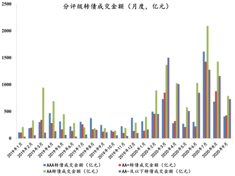 ❖ 相似点:权益震荡,缺乏指数级行情;纯债收益率上行提升机会成本5月部分理财资金赎回引发负反馈,9月下跌更多是由于高位缺乏信心5月下跌后平均转股价值在90元附近,而9月下跌后平均转股价值仍超过95元5月底10年期国债到期收益率在2.7%附近,而9月底上升至3.1%以上,机会成本显著上升❖ 相比5月平价、估值“双杀”后的情况,目前转债平价和绝对价格偏高、权益市场高位震荡、纯债端的机会成本也偏高,我们认为是高价+高弹性的次优机会❖Q3市场成交进一步放量,但主要集中在7月,8、9月持续递减;❖具体来看,“小妖票”性质的转债炒作虽然有一定反复,但整体已逐渐退出市场范围。AA转债成交占比最高,AAA\AA+的成交占比亦显著提升;❖从换手率的角度,当前市场活跃度再一次滑落至5月底至6月的水平,但仍处于2018年以来的高位;❖9月29-10月初的反弹并没有看到换手率的显著上升,侧面说明了此轮行情与7月初可能有较大不同,后续观察活跃度能否再次回升;绝对价格角度:市场整体价格水平仍不低,更强调市场的交易属性