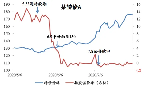 ❖ 市场情绪较好的阶段,正股市场认可度较高的转债,临近赎回期溢价率往往逐渐压缩,赎回对正股的冲击也相对有限。典型案例为某转债A。