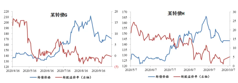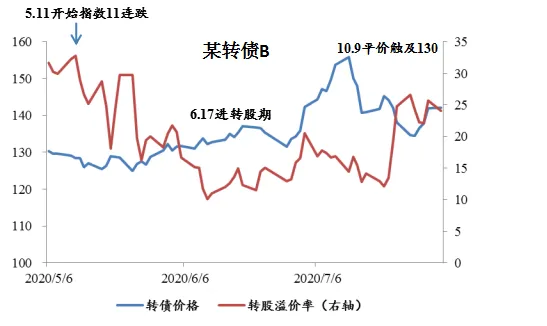 ❖ 市场情绪较差的阶段,正股信心不足的转债,赎回期前后即使正股不上涨,溢价率也会主动大幅压缩,转债赎回可能对正股走势形成一定扰动。这一阶段转债上涨的条件较为苛刻——正股在赎回前的短时间内大幅上涨。某转债B等均为此类情况。