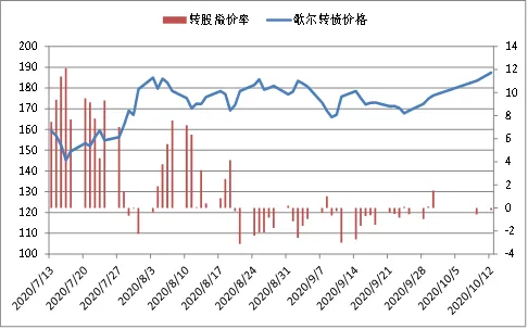 6月中旬-8月上旬转债持续上涨,主业估值超过50x PE,此后波动幅度有所加大,9月上旬跟随食品饮料和农林牧渔板块回调,9月25日进入转股期后转债相对正股的稳定性降低。