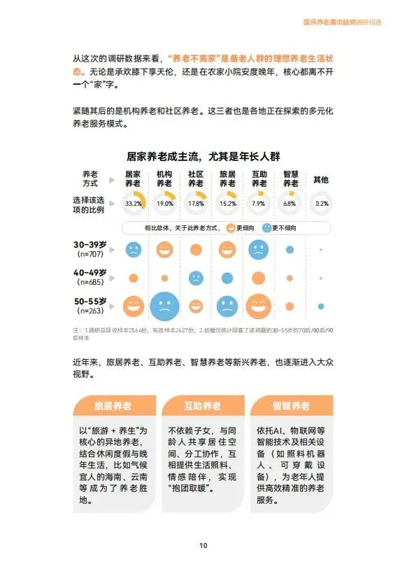 除了居家养老,部分备老人群也在关注旅居养老、互助养老、智慧养老等新兴养老方式。