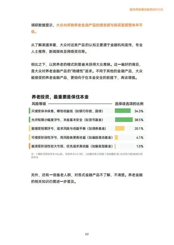 相比之下,以房养老的模式则普遍未获得大众青睐。这一偏好的背后,是大众对养老金融产品的“稳健性”追求。不同于其他的金融产品,大众能接受的养老金融产品,更倾向于在本金安全的前提下,再谈增值。