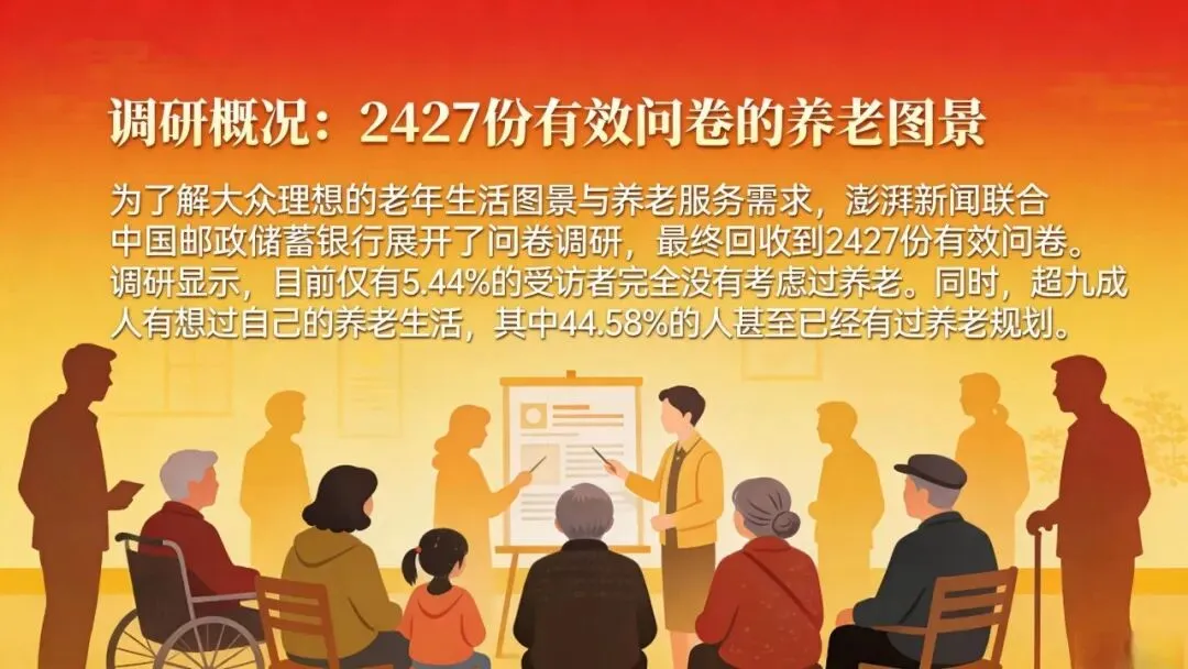 在这样的大背景下,养老已经成为了全社会都需要面对的话题。澎湃新闻联合中国邮政储蓄银行展开的问卷调研显示,目前仅有5.44%的受访者完全没有考虑过养老。超九成人有想过自己的养老生活,其中44.58%的人甚至已经有过养老规划。