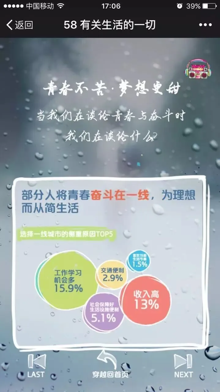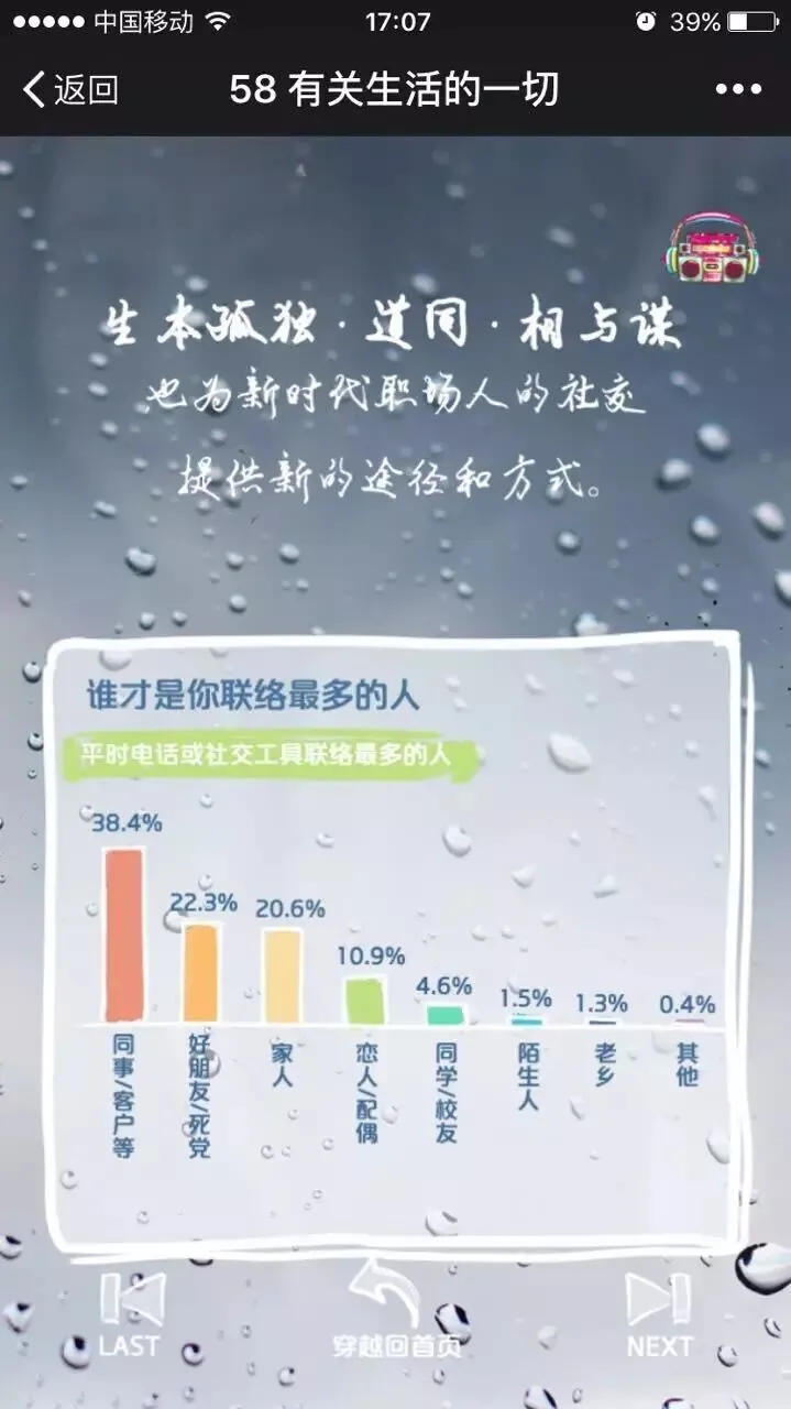 除了蜻蜓FM的跨界合作,58集团还通过创新H5形式让数据不再枯燥,公众号、传播网络渠道等组合拳形式,达到叠加的传播效果。这些传播始终围绕一个痛点——贴近目标群体的职场生活与职场体验,通过极富情感的文字,勾起心中的共鸣。minisite上线3天内,访问量便突破80万。