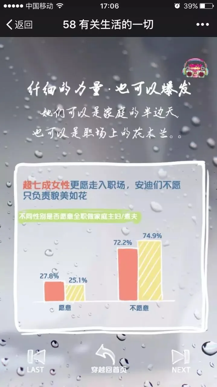 招数二:通过第一感官更容易打动人 除了传播稿件在文案上下足功夫之外,58与本次活动战略合作伙伴蜻蜓FM共同打造的营销史上第一个“可听的数据报告”。