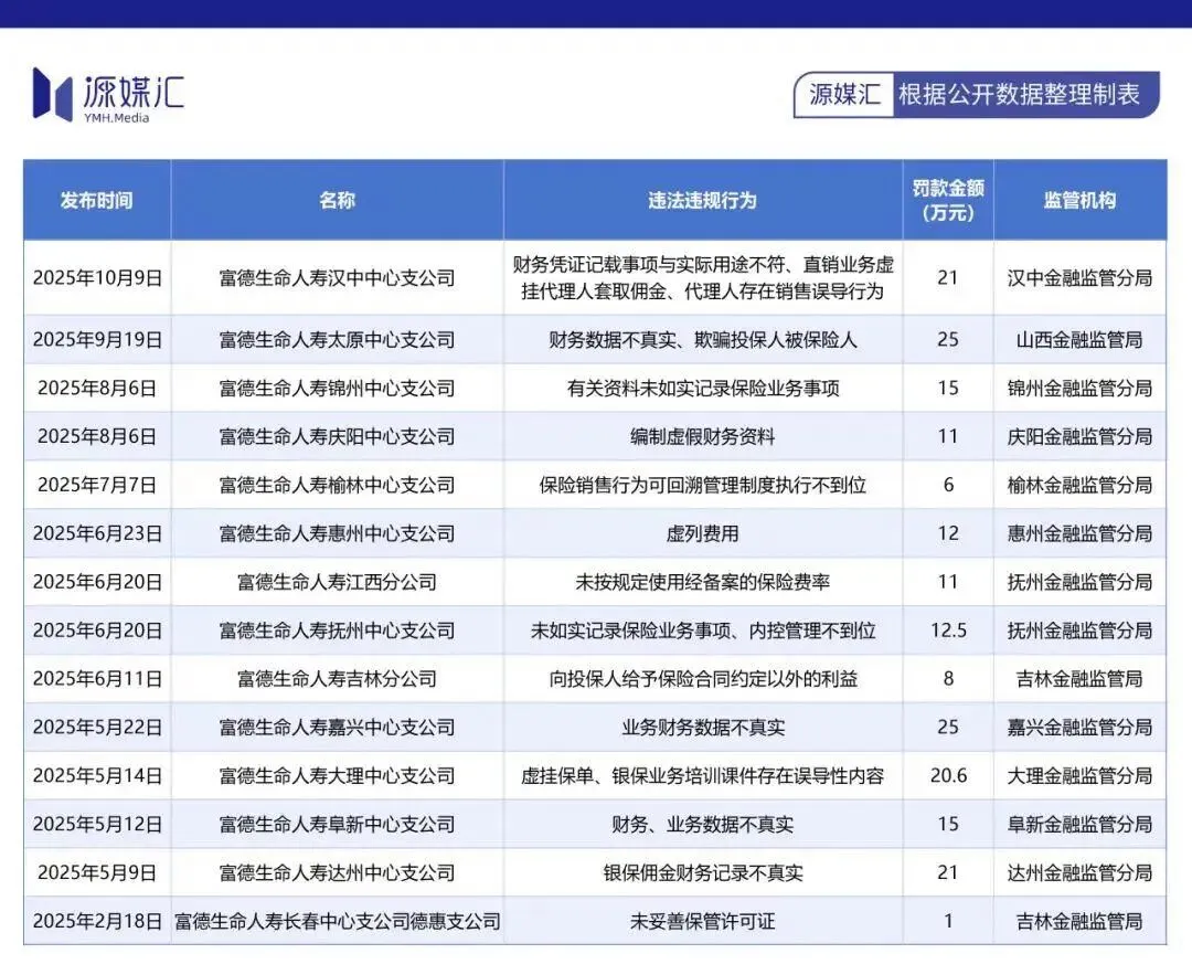 2025年,富德生命人寿遭遇了监管罚单的集中轰炸。仅在下半年,山西、太原、嘉兴、辽宁、许昌等多地分支机构被罚,金额及频次也不低。(当然,这些处罚其他家也都有不同程度和情况的哈)