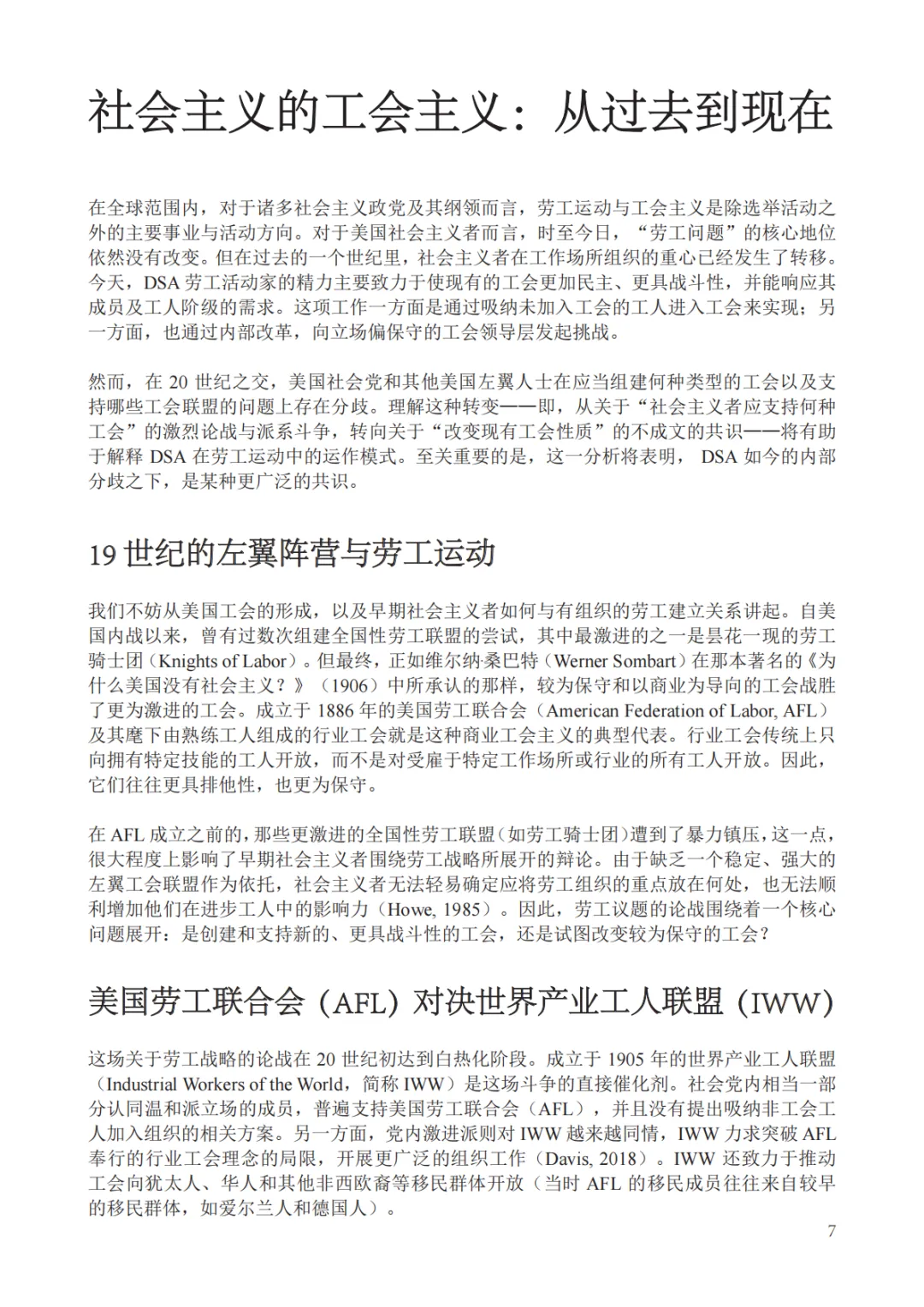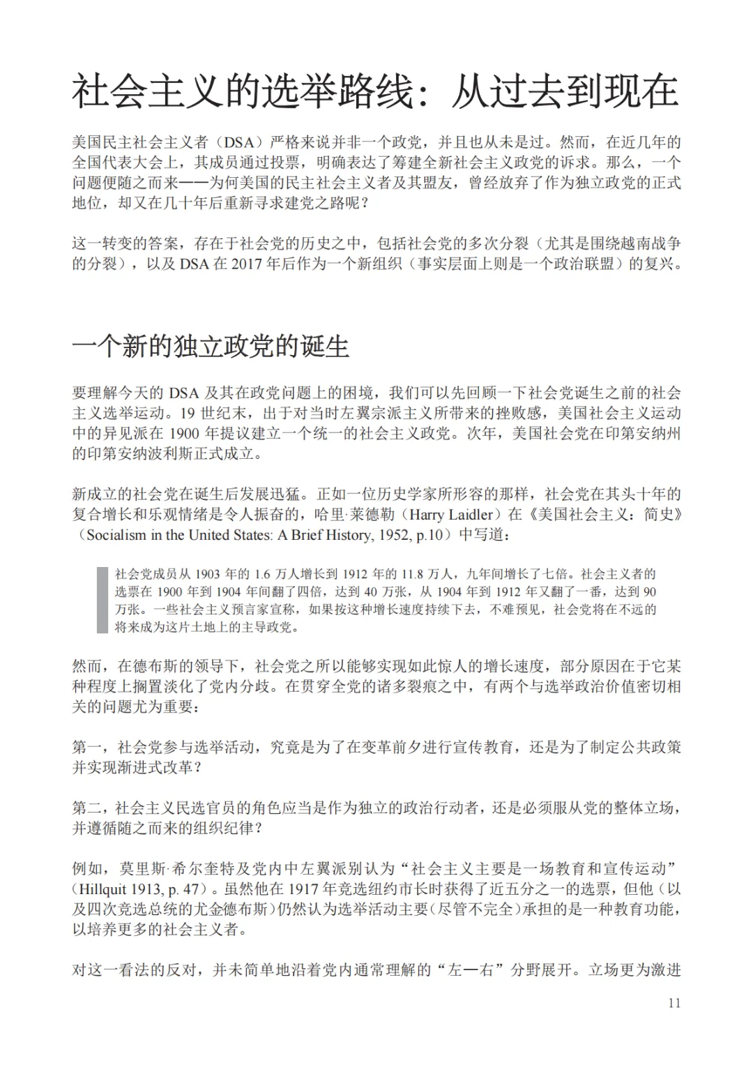 这篇由大卫·杜阿尔德撰写、罗莎·卢森堡基金会发布的报告《社会主义在美国:德布斯时期社会党与新时期美国民主社会主义的历史比较报告》,旨在通过历史比较的视角,为当代美国最大的社会主义组织——美国民主社会主义者(DSA)寻找更精准的政治定位与战略参照系 。报告的核心立论在于指出,理解今日DSA的最佳历史镜像并非20世纪60年代的新左翼学生运动(如SDS),而是20世纪初尤金·德布斯领导下的“美国社会党”(SPA) 。作者认为,这两个组织都处于“冷战”逻辑之外(前者在冷战前,后者在冷战后),且都面临着如何在资本主义核心地带建立一个具有广泛群众基础的社会主义政治联盟的挑战。