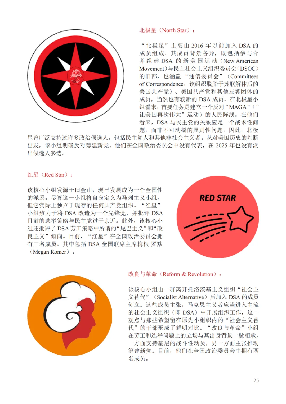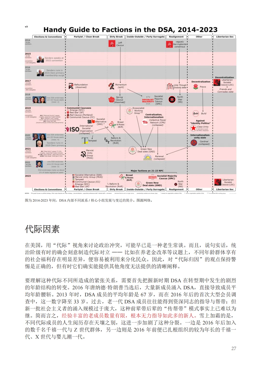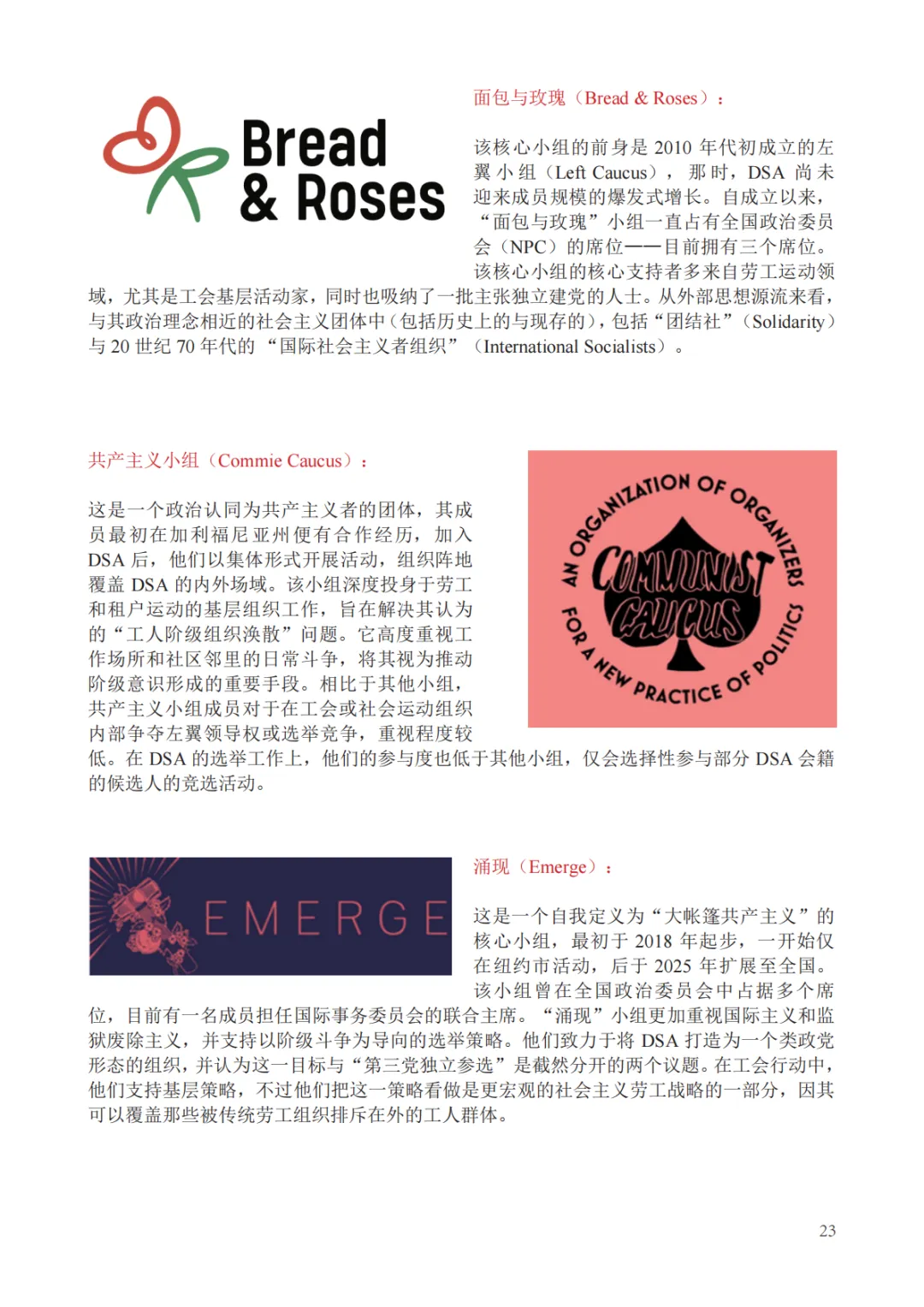 此外,报告深入剖析了社会主义组织的内部生态,指出无论是昔日的社会党还是今日的DSA,本质上都是“联盟式政党”,内部派系林立、思潮多元是其常态而非病态 。报告详细梳理了DSA内部诸如“面包与玫瑰”、“社会主义多数派”、“马克思主义团结小组”等核心小组的政治光谱,指出这种源于本土反建制传统和代际差异的内部博弈,在民主机制和共同政治目标(如桑德斯的竞选运动)的驱动下,能够形成一种动态的团结 。