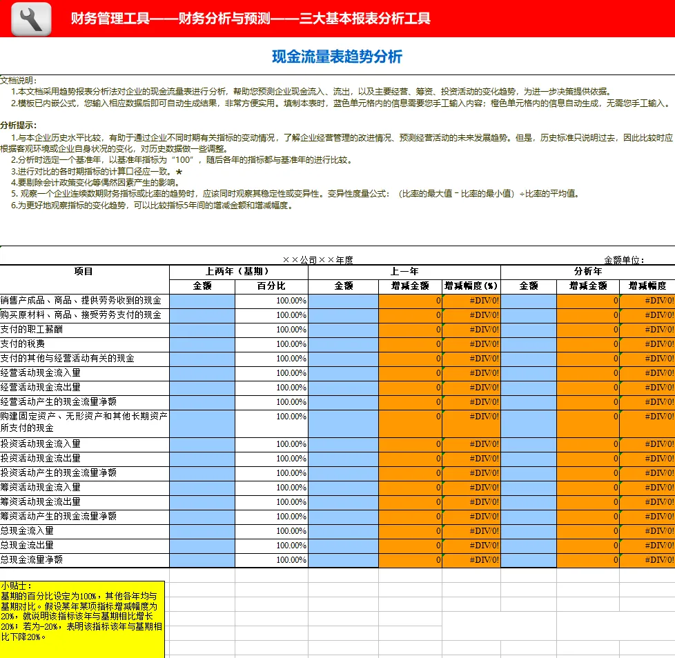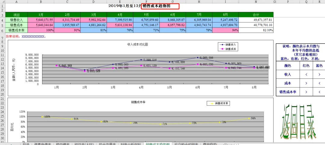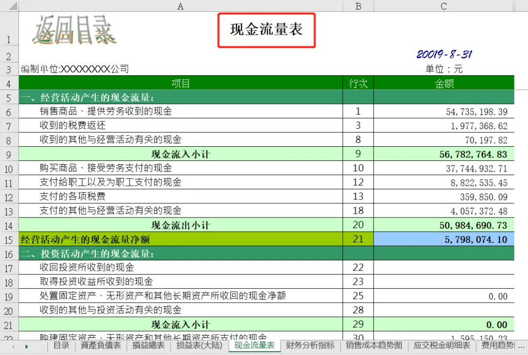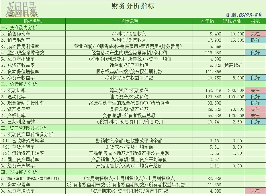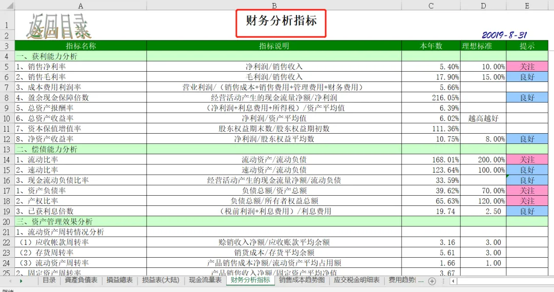 此表从目录我们可以看到,包含资产负债表、损益表、现金流量表、财务分析指标、销售成本趋势和五大费用明细表:制造费用、管理费用、财务费用、营业费用、费用趋势图,一共有19张表从方方面面帮助大家分析数据,站在管理角度为企业提供解决问题的方案。本套资料还包含三大表分析工具、流动负债构成分析表、年度现金流逐月预测模板、现金流量表构成分析模板、现金流量表-年报、现金流量表-月报、现金流量表趋势分析模板、盈利能力分析工具等,预览如下: