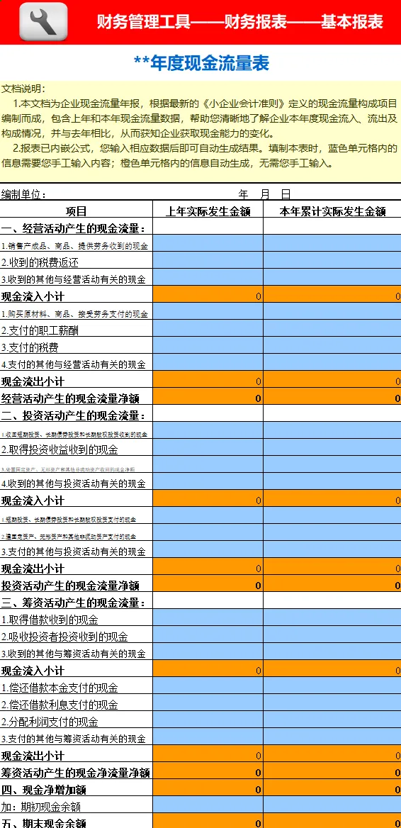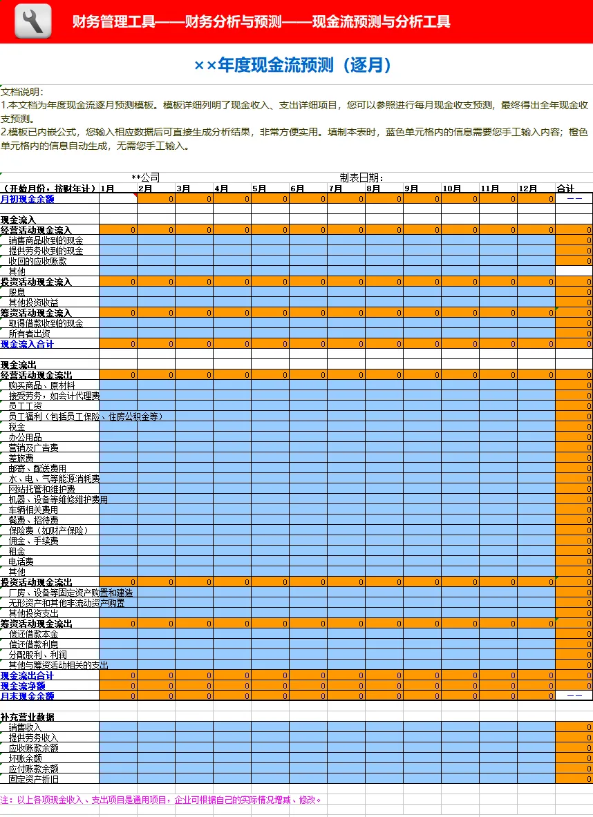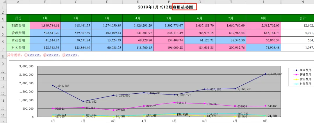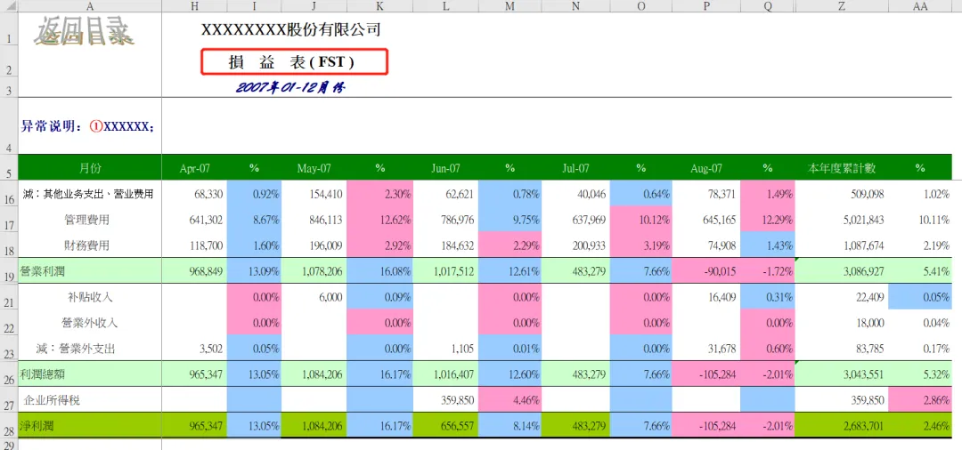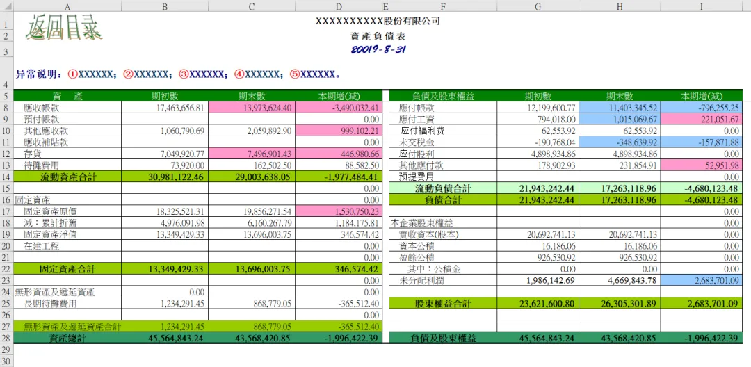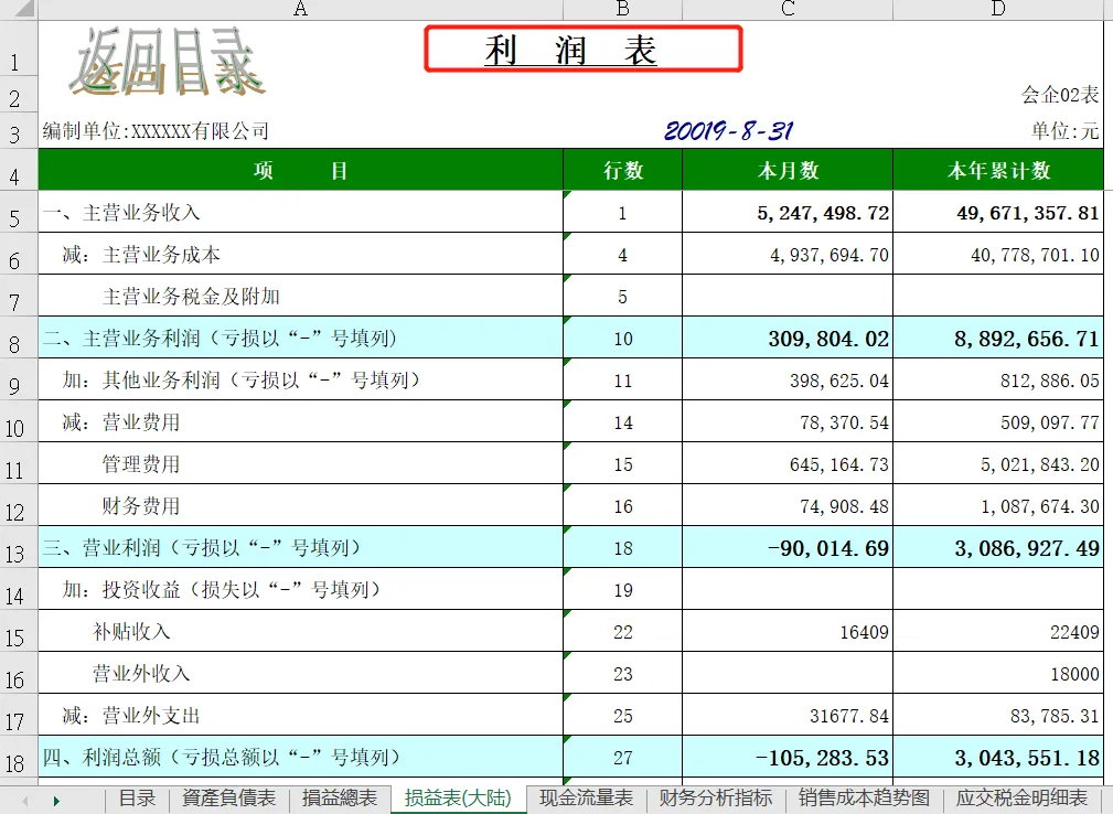 此表从目录我们可以看到,包含资产负债表、损益表、现金流量表、财务分析指标、销售成本趋势和五大费用明细表:制造费用、管理费用、财务费用、营业费用、费用趋势图,一共有19张表从方方面面帮助大家分析数据,站在管理角度为企业提供解决问题的方案。本套资料还包含三大表分析工具、流动负债构成分析表、年度现金流逐月预测模板、现金流量表构成分析模板、现金流量表-年报、现金流量表-月报、现金流量表趋势分析模板、盈利能力分析工具等,预览如下: