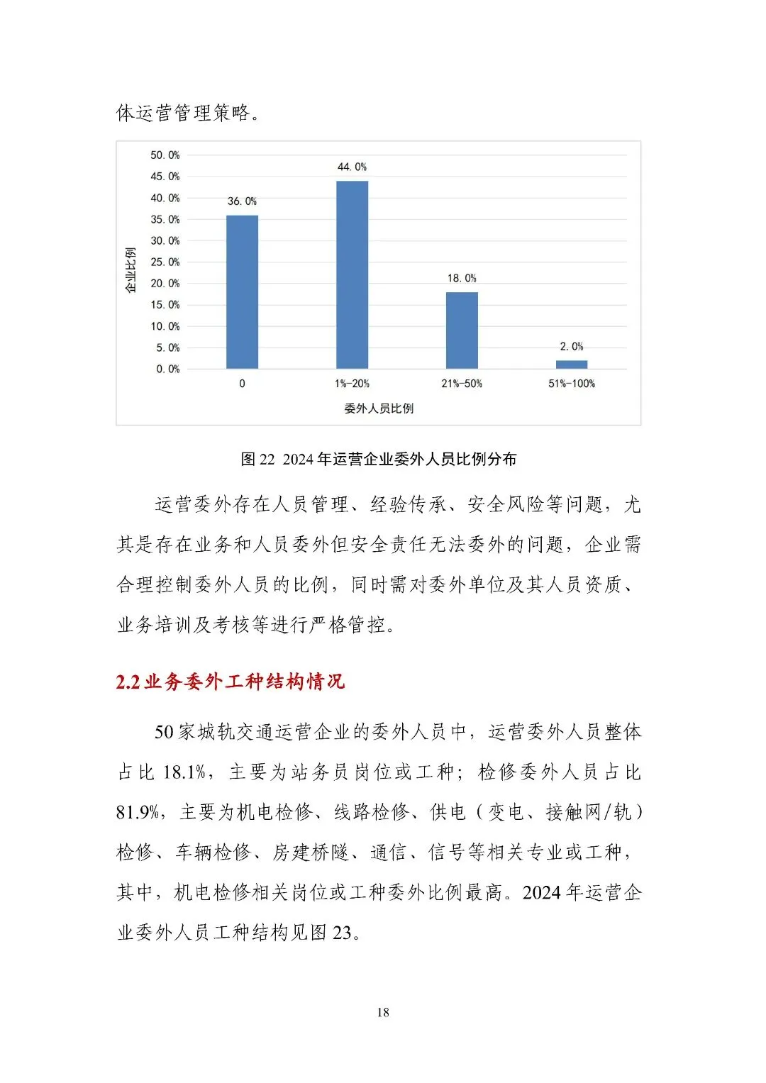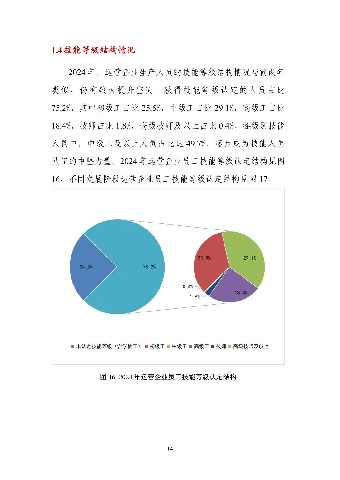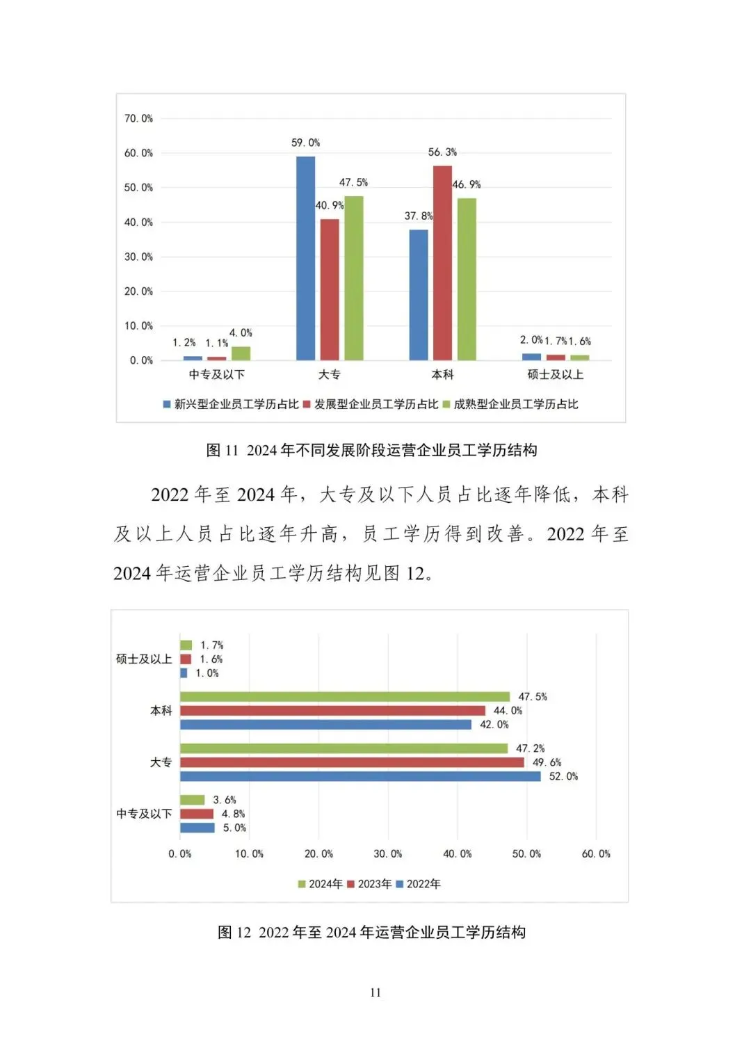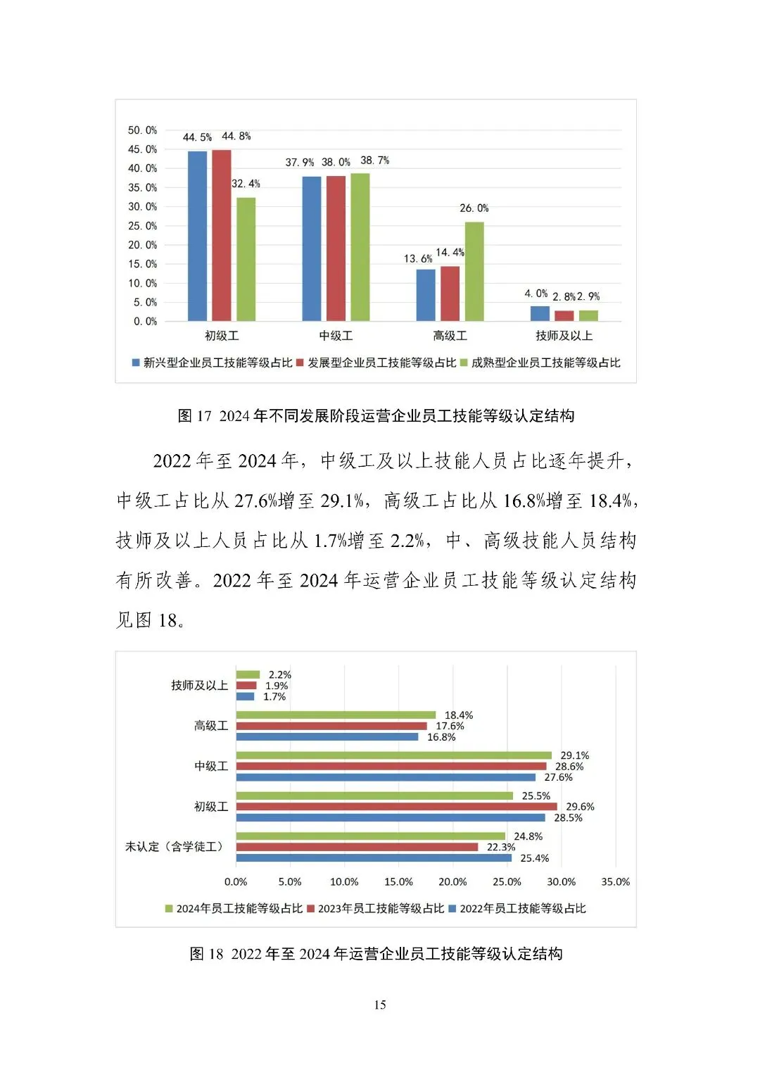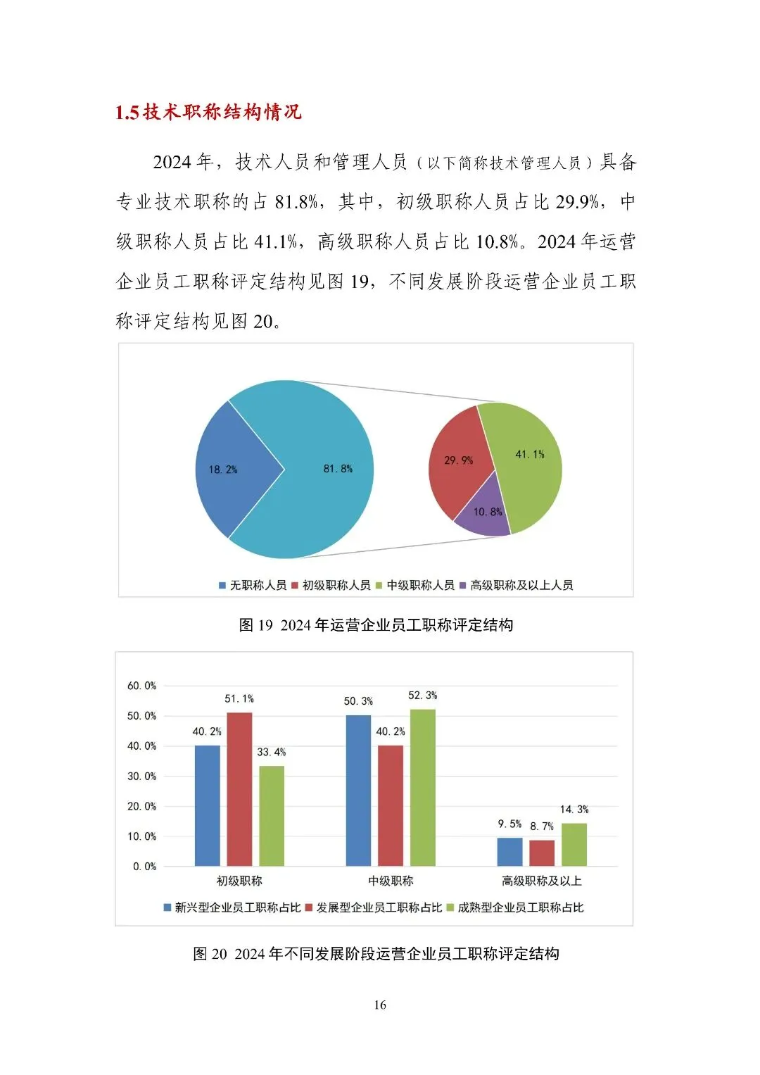 第二部分 “运营企业人力资源统计与分析” 以不同发展阶段运营企业为样本,从岗位、学历、年龄、技能等级、职称结构等维度分析人员情况,还涉及业务及人员委外、生产人员技能认定、技术管理人员职称评定、企业培训师体系搭建、培训基地建设、员工培训、职业技能竞赛、人员需求与流动等多方面内容。