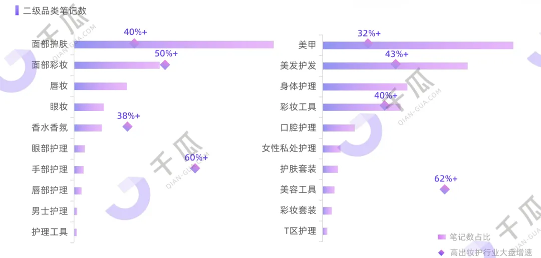调研二级品类笔记数,面部护肤、面部彩妆持续高热,占比分别位层TOP1、TOP4;美甲、美发护发、彩妆工具、香水香氛、手部护理声量增长迅猛,均超过妆护大盘平均增速,其中美甲、美发护发、彩妆工具占比跻身前十。