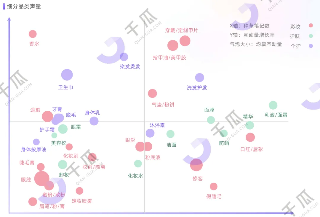 2、彩妆品类中,香水、穿戴甲增势强劲,互动较品类平均增速分别高出82%+、66%+,眼线、修容遮瑕、口红等,均篇互动高于市场中位数;