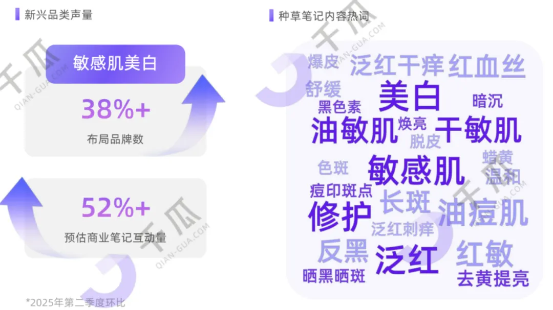 探查用户需求,种草热词频现"敏感肌、油敏肌、干敏肌"肤质词,以及"泛红、暗黄、色斑"等痛点词并高度关联"美白、修护、焕亮"等功效需求。基于此追踪二季度环比数据发现,"敏感肌美白"品类热度持续攀升,预估商业笔记互动增长52%+,布局品牌数增长38%+,诸多知名品牌皆在布局。
