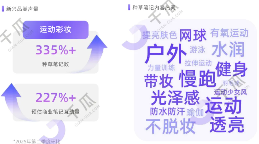 调研热门笔记场景词,频现"运动、户外、健身、慢跑、网球",同时关联"不脱妆、光泽感、透亮、水润"等热词;调研数据显示,二季度"运动彩妆"热度飙升,种草笔记数环比增长335%+,预估商业笔记互动增长227%+,品牌纷纷加码运动场景。小红书运动户外热情高涨,不止穿搭,日常妆造人们也希望呈现活力、自信的生活表达,"运动妆容"应运而生。