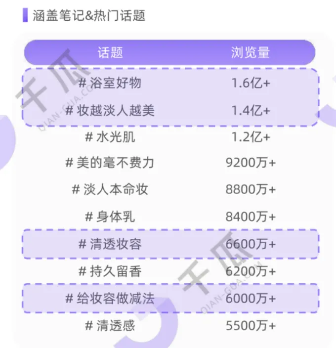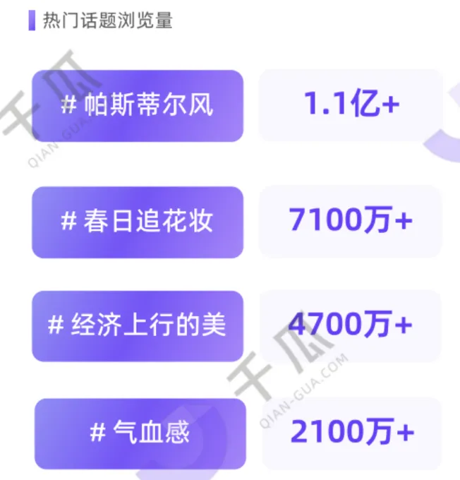 · 妆越淡人越美、给妆容做减法,浏览量分别为1.4亿+、6000万+"自然、通透、低饱和、零负担"成为妆效热词,带动无粉底妆、呼吸感妆走红,用户转向拥抱"会呼吸的美";