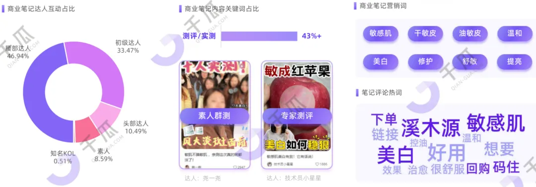 上半年小红书投放数据显示,品牌以腰部、初级达人为主力,二者互动合计超八成。"氧白因"产品推广,涉及"测评、实测"的商业笔记超43%,通过素人群测、专家测评,科普敏肌美白解决方案,进行功效实证。关键词布局方面,以"敏感肌、干敏肌、油敏肌"细分人群肤质,并凸显"温和、修护、舒敏"核心成分功效,进一步消解"美白产品刺激性"的消费顾虑。查看用户评论,"溪木源"品牌词评论热词位列TOP1,"温和、美白"位列评论功效词TOP1、TOP2,码住、好用、回购"也位列前排,种草成效显著。