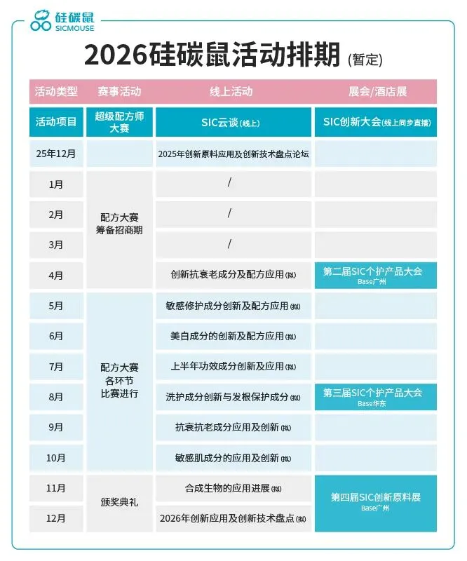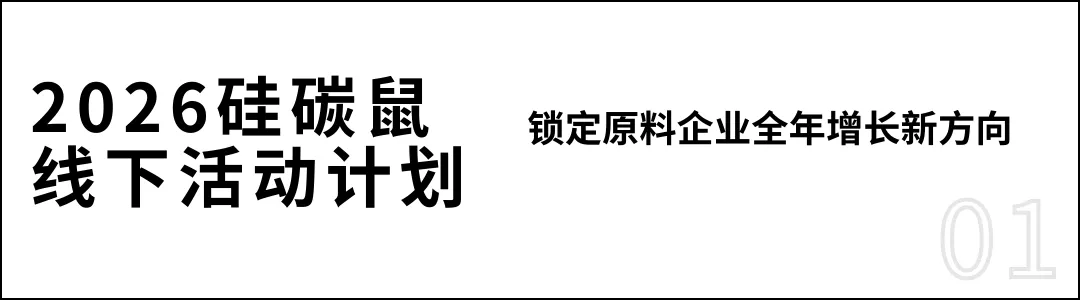 硅碳鼠2026年活动计划已基本落定。为原料企业推广提供 “年度市场计划” :全年三场大会+IP赛事等贯穿全年曝光。我们聚焦产品应用、提供精准的展示舞台,你带上好产品,按计划亮相,即可稳定收获行业关注。