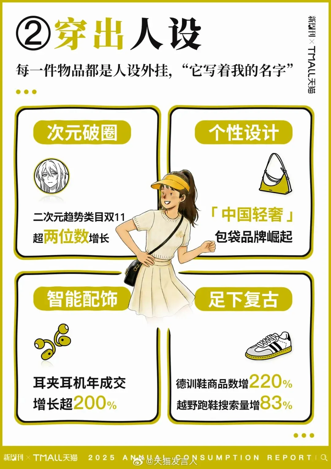 「穿出人设」:每一件物品都是人设外挂。2025 年,年轻人的消费逻辑里,「不同」比「认同」更重要。他们通过消费彰显独特的审美,耳夹耳机、设计师包袋、复古薄底鞋……每个单品都要「写着自己的名字」。