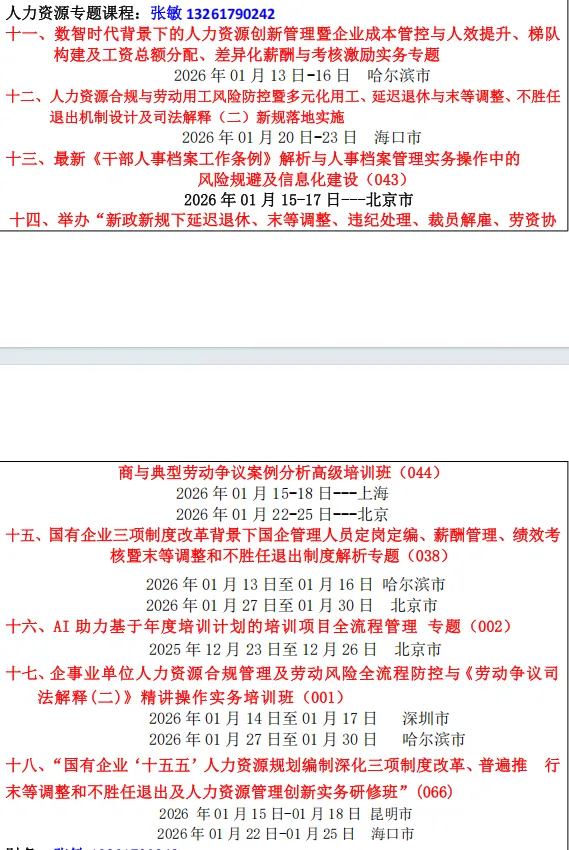 建立完善的现代企业人力资源管理制度是提高国企竟争力的关键步骤。为帮助企业深入理解最新政策导向及数智时代人力资源管理的变革趋势,切实解决企业当前面临的人力成本过高、人效低下、人才管理困难以及薪酬绩效体系设计等重点难点问题,实现国企工资总额与效益、效率双挂钩,企业薪酬水平与员工劳动价值、经营业绩、绩效考核紧密联动,深度绑定激励机制,激发企业内在活力,为深化国企改革提供有力支撑,推动国企在数智时代实现高质量发展。为此,中国人力资源开发研究会培训中心联合北京中会联管理咨询中心定于2026年1月在哈尔滨市举办“数智时代人力资源创新管理暨企业用工成本管控与人效提升、人才梯队构建及国企工资总额管控下薪酬绩效管理与中长期激励实务”培训班。希望各单位积极组织相关人员参加。现将有关事宜通知如下,详见附件。