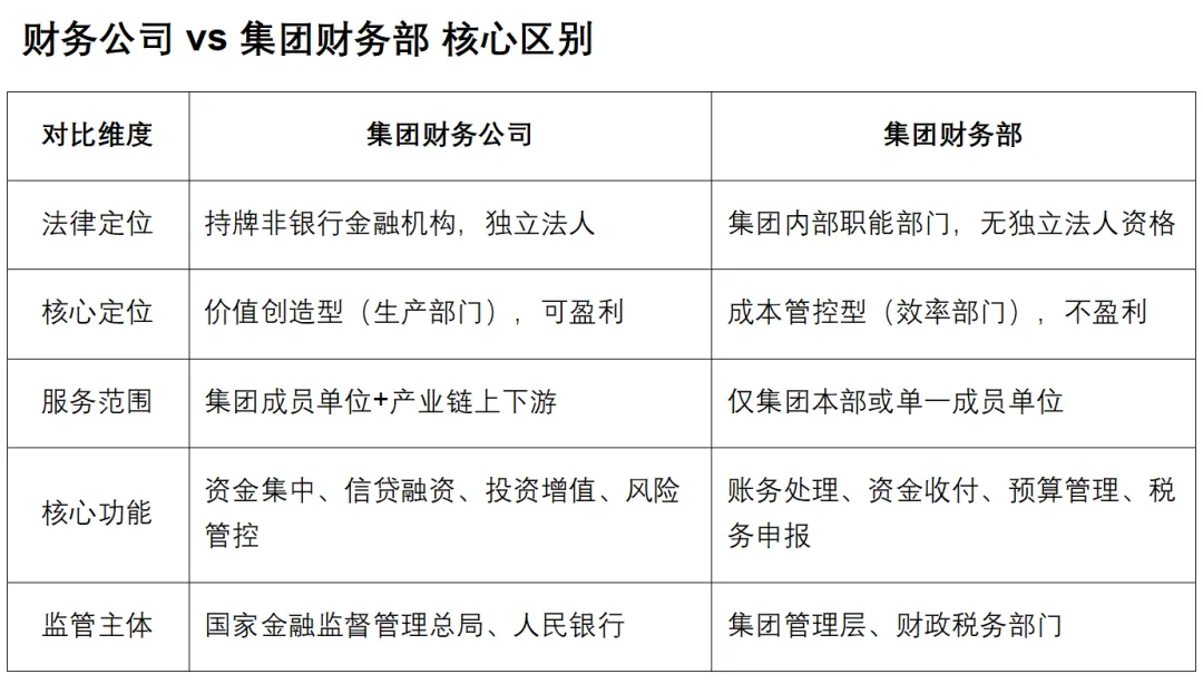 财务公司的核心价值是“以金融手段赋能产业”,通过资金集中运营、定制化金融服务等方式降低集团综合成本、创造利润,是集团的“生产型金融部门”;而财务部仅为成本/效率部门,无盈利职能。具体核心作用可概括为4点: