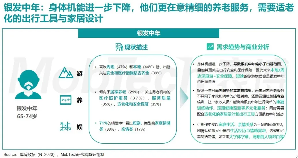 银发中年人群倾向于居家养老,重视养老机构的医疗照护服务、服务质量以及适老化和安全程度。他们在旅游时更偏爱周边和本地游,特别关注安全和医疗措施是否齐全。此外,他们对精神文化生活的需求也在不断增加,如观看家庭情感类和亲情类短剧等。