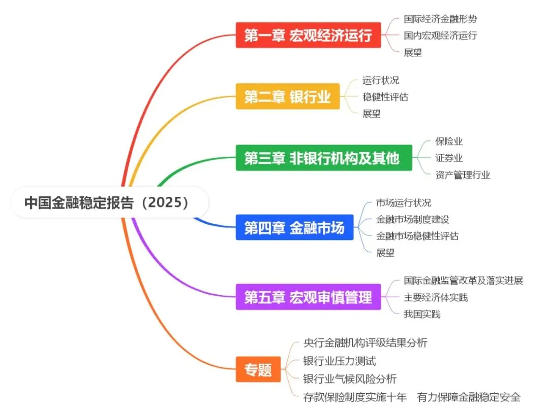 12月26日,中国人民银行发布了《中国金融稳定报告(2025)》,全景式概括了2024年我国金融体系的运行状况、监管进展与展望。本系列文章将对报告进行解读,并将探讨相关部门所涉及的议题。本文采取思维导图与简析的方式,梳理了报告的主要内容,并记录了些许学习心得。