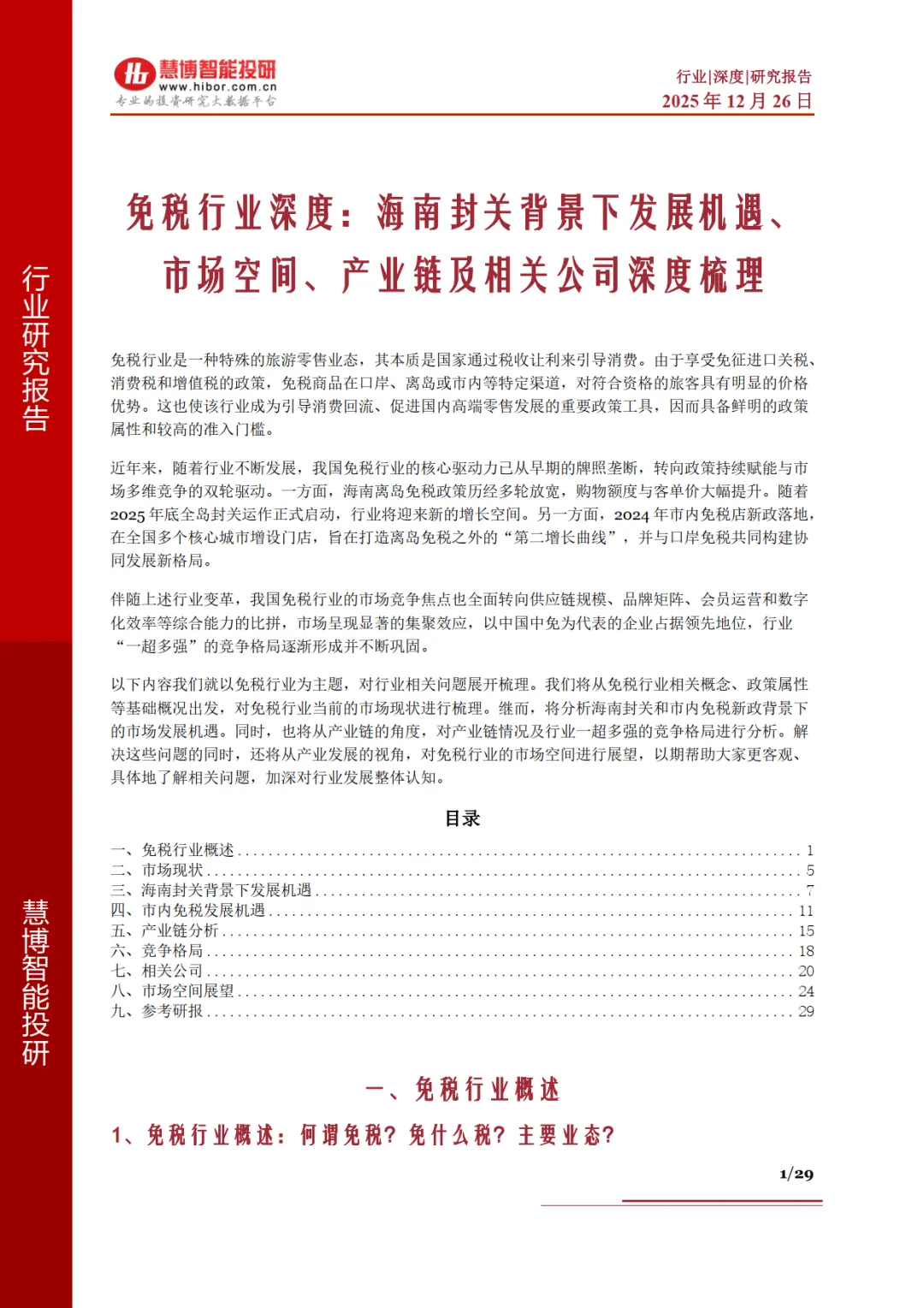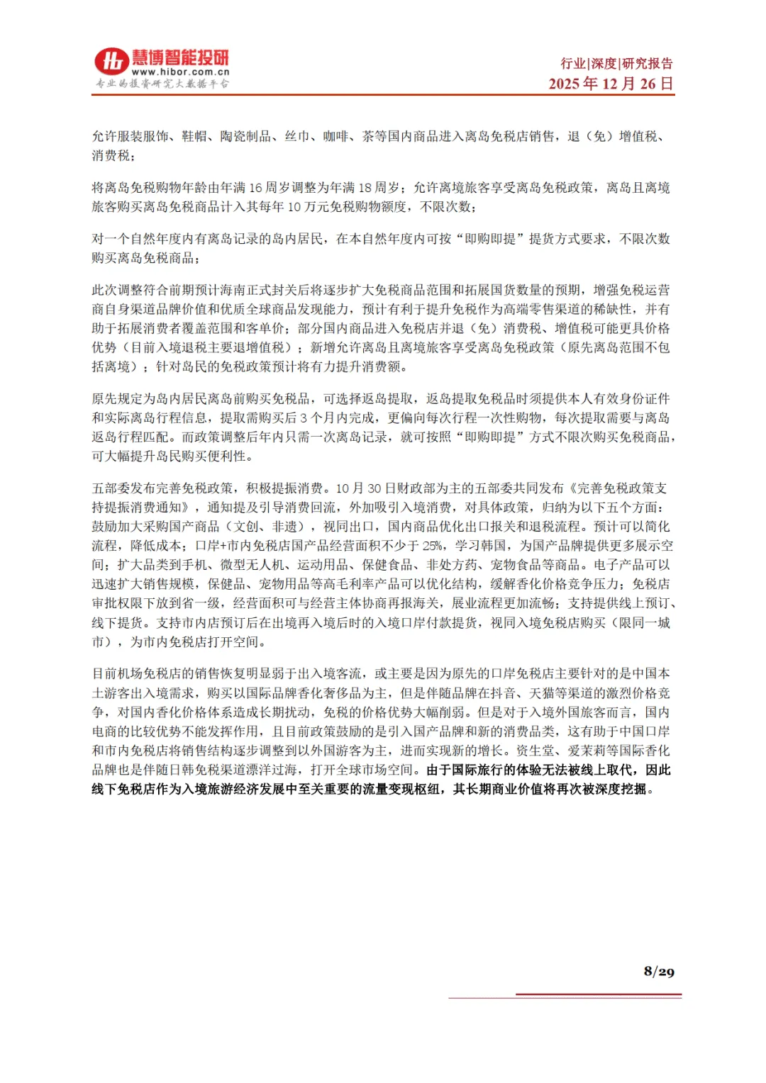免税行业作为政策驱动的特殊旅游零售业态,凭借免征关税、消费税和增值税的价格优势,成为引导消费回流、促进高端零售发展的核心载体。当前行业核心驱动力已从牌照垄断转向政策赋能与市场竞争双轮驱动,2025 年底海南全岛封关启动与市内免税新政落地,共同开启行业增长新周期。