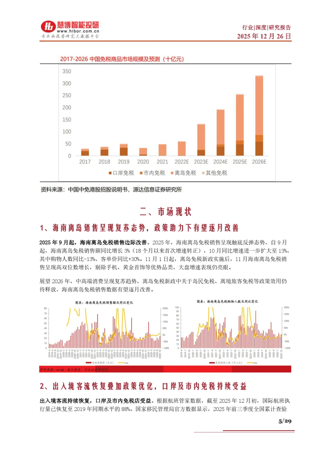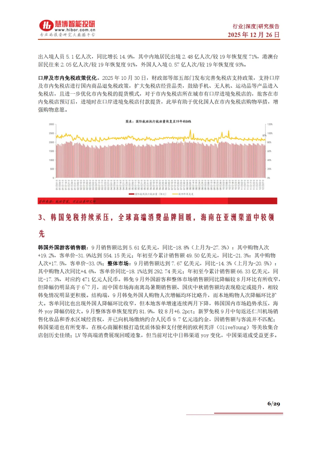 行业现状呈现多重积极信号。海南离岛免税自 2025 年 9 月起销售触底反弹,11 月新政实施后实现高双位数增长,客单价同比提升 30%;出入境客流持续恢复,2025 年前三季度累计查验 5.1 亿人次,国际航班执行量恢复至 2019 年的 88%,带动口岸及市内免税受益。市场格局呈现 “一超多强” 特征,中国中免以 78.7% 的市场份额稳居第一,海发控、海旅免税等差异化竞争。