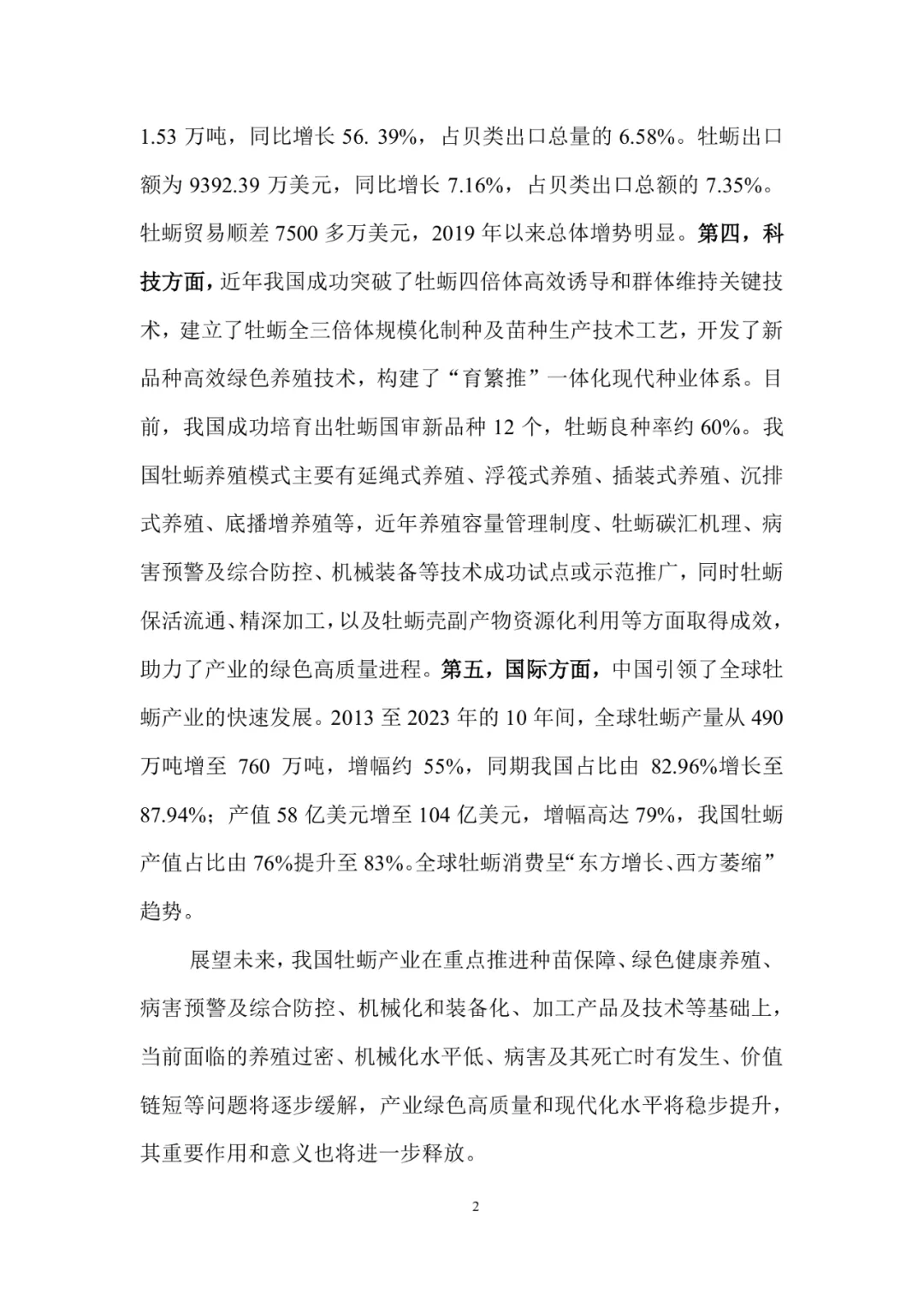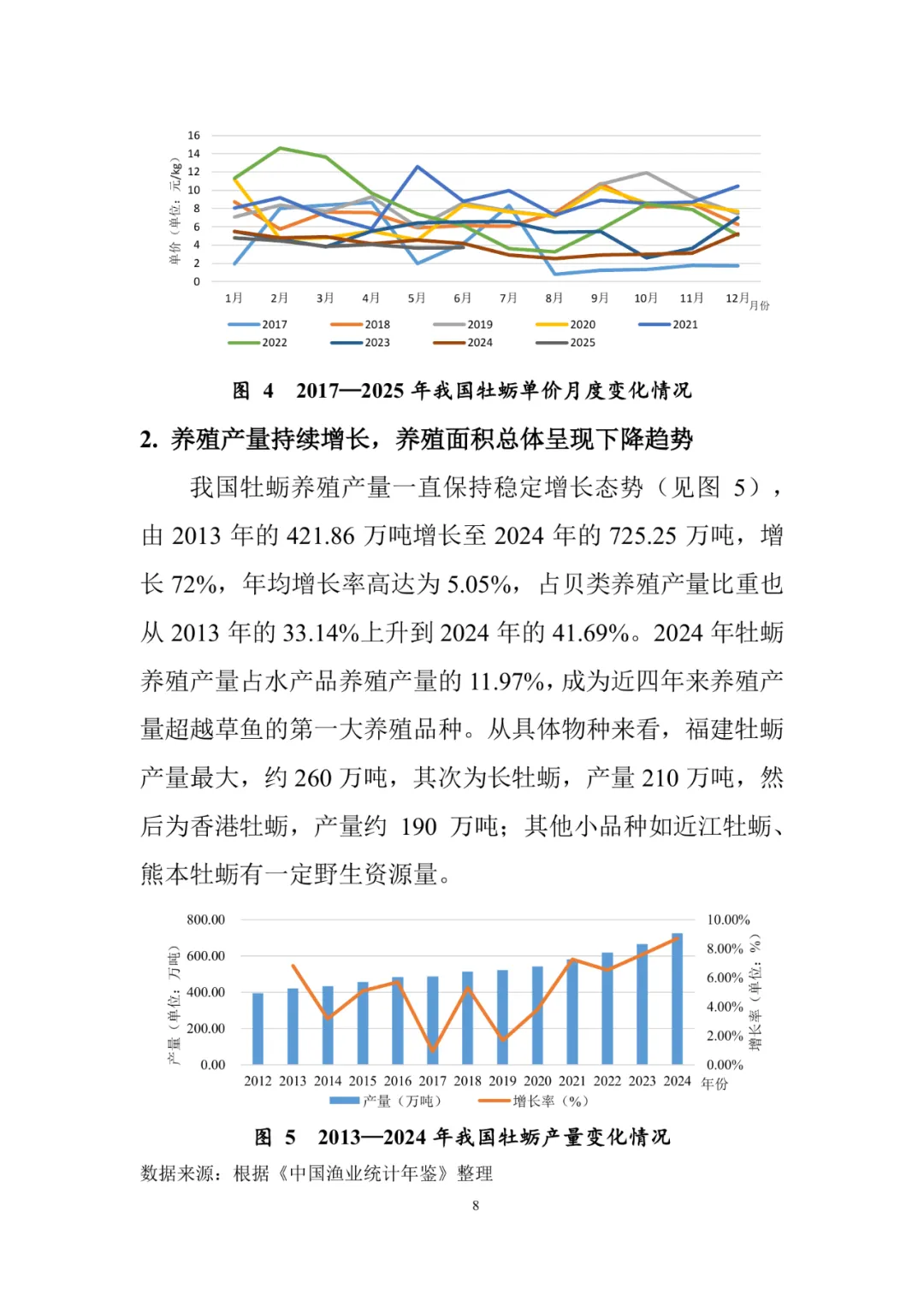 中国牡蛎产业发展报告聚焦于产业现状、市场动态、科技进展及国际趋势。报告显示,国内牡蛎产业规模持续扩大,区域分布呈现集中化特征,养殖成本与收益变化对行业影响显著。消费端数据显示人均消费稳步增长,市场价格波动受到供需关系和季节因素影响。国际贸易方面,出口量与金额保持稳定上升,进口则出现波动下降,贸易顺差逐步扩大,显示出较强的国际竞争力。在科技领域,我国在牡蛎育种、养殖模式优化及加工技术等方面取得重要进展,推动产业向高质高效方向发展。随着技术进步和市场需求变化,牡蛎产业将面临新的机遇与挑战。需重点关注生态可持续性、产业链延伸以及应对国际市场变化等问题,以实现产业长期稳定发展。