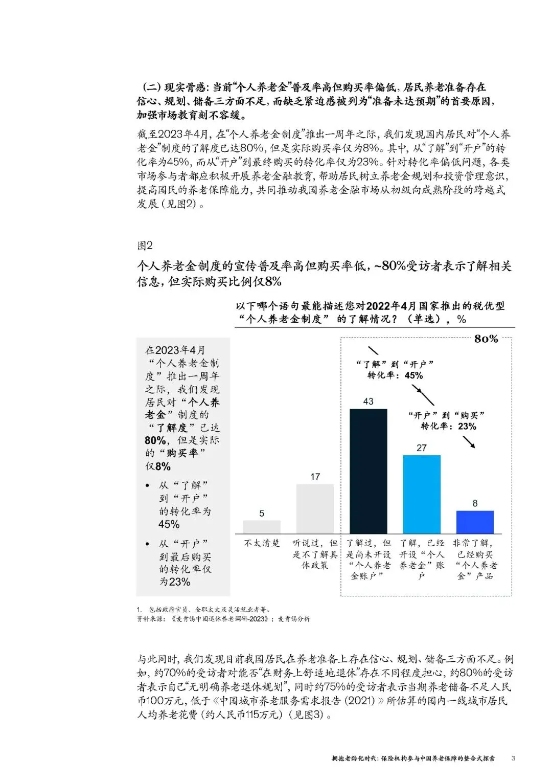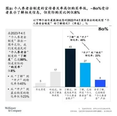 和高涨的养老意愿形成鲜明对比的,是滞后的养老行动。截至2023年4月,个人养老金制度推出一周年时,居民对这一制度的了解度已经达到80%,但实际购买率仅为8%。其中,从“了解”到“开户”的转化率是45%,从“开户”到“购买”的转化率更是低至23%。