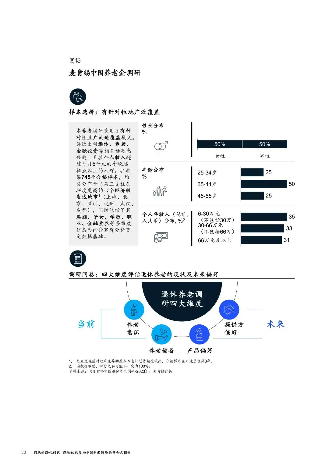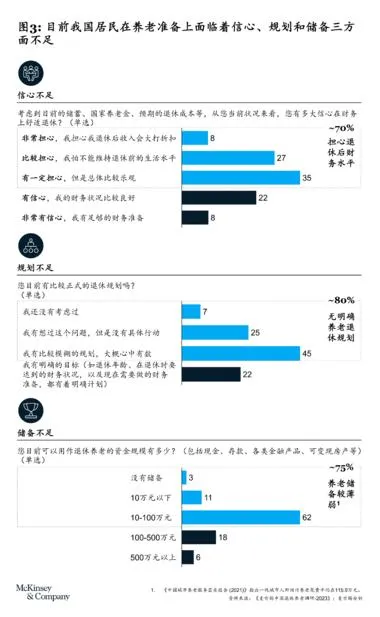 麦肯锡的调研覆盖了上海、北京、深圳等6个经济发达城市的745个合格样本,最终得出的核心结论是:居民养老退休愿望美好,但现实差距明显,金融机构需以“客群驱动”模式,助力居民完成从“知道要养老”到“落实养老行动”的跨越。这一结论,主要源于三方面的调研发现。
