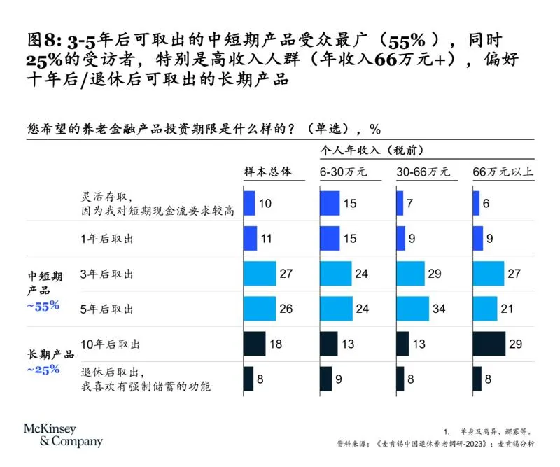 具体来看,不同客群的差异十分明显:比如高收入者(税前年收入66万元以上)和企业主的风险偏好更高,约30%-40%的人愿意选择中风险养老产品,而普通样本中这一比例仅为20%;在投资期限上,55%的人偏好3-5年的中短期产品,但25%的人(尤其是高收入人群)偏好10年以上的长期产品;领取方式上,44%的人希望“每年领取固定金额”,38%的人希望“前十年多领、十年后少领”,仅10%的人选择“一次性领取”。