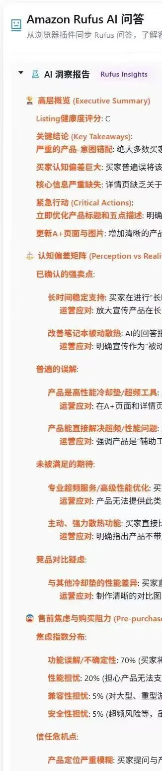这份图片展示的是一份关于 Amazon Rufus AI(亚马逊购物助手)生成的“AI 洞察报告”。该报告针对某个特定的电脑冷却/散热产品进行了分析,指出该产品存在严重的定位偏差。