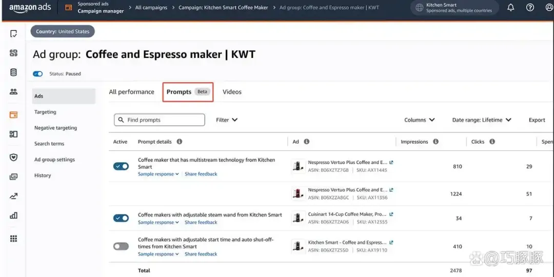 最近,不少美国站卖家都在广告后台发现了一个叫“提示词(Prompts)”的新功能入口。
