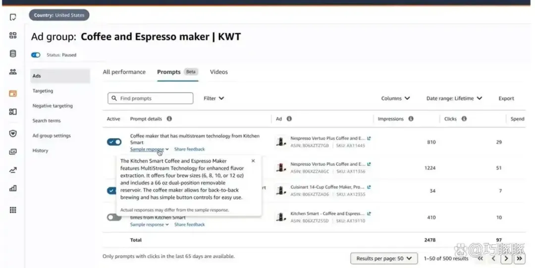 在后台,你可以看到系统为你的产品匹配了哪些“提示词”,并能查看每个提示词带来的曝光、点击和花费。就目前来说,你可以随时选择开启或关闭某一个具体的提示词,但不能主动添加。