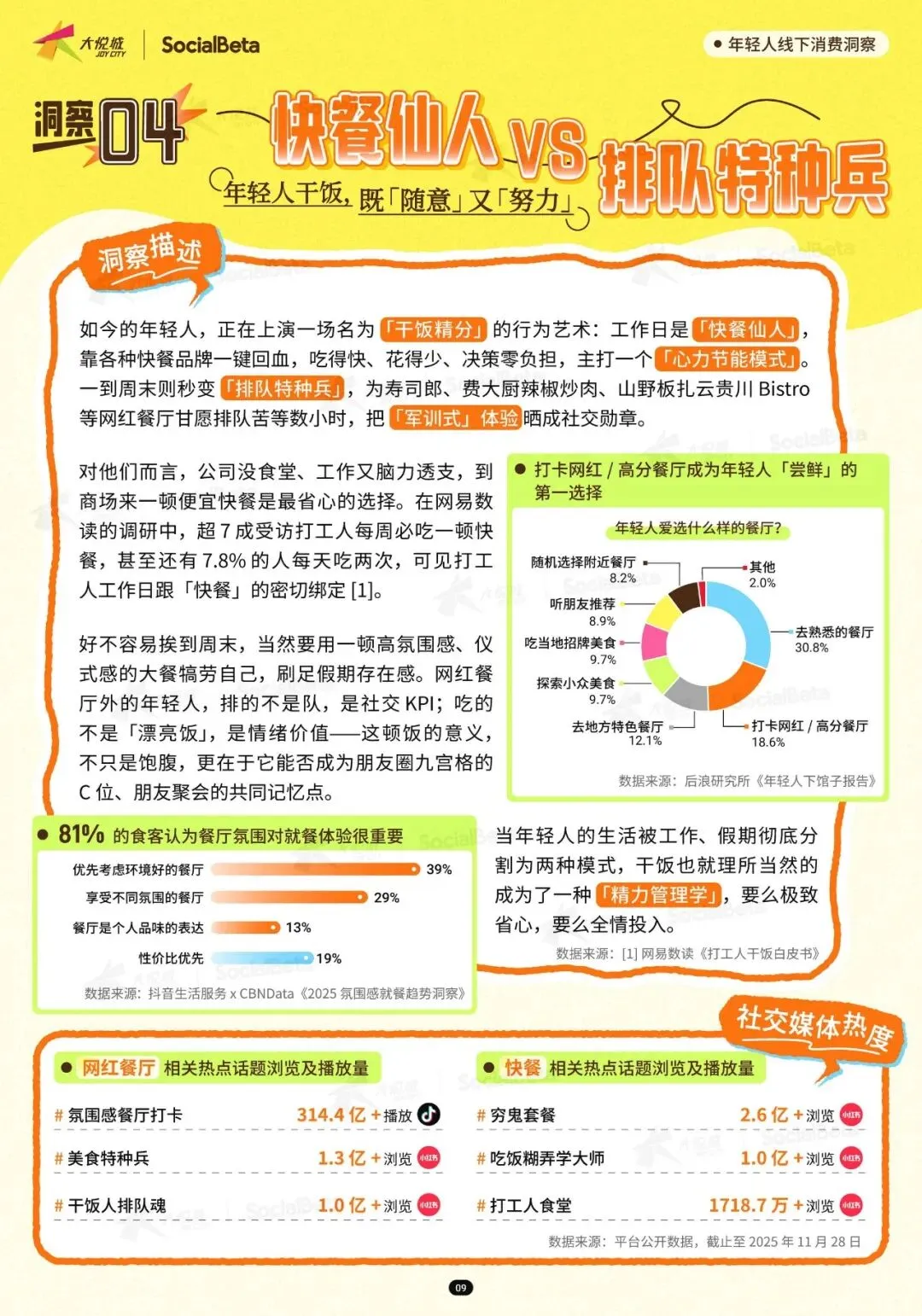 年轻人的餐饮消费呈现出鲜明的 “两极分化” 特征,一边是追求高效省心的快餐消费,一边是注重氛围体验的仪式感大餐,“精力管理学” 在餐饮选择中体现得淋漓尽致。