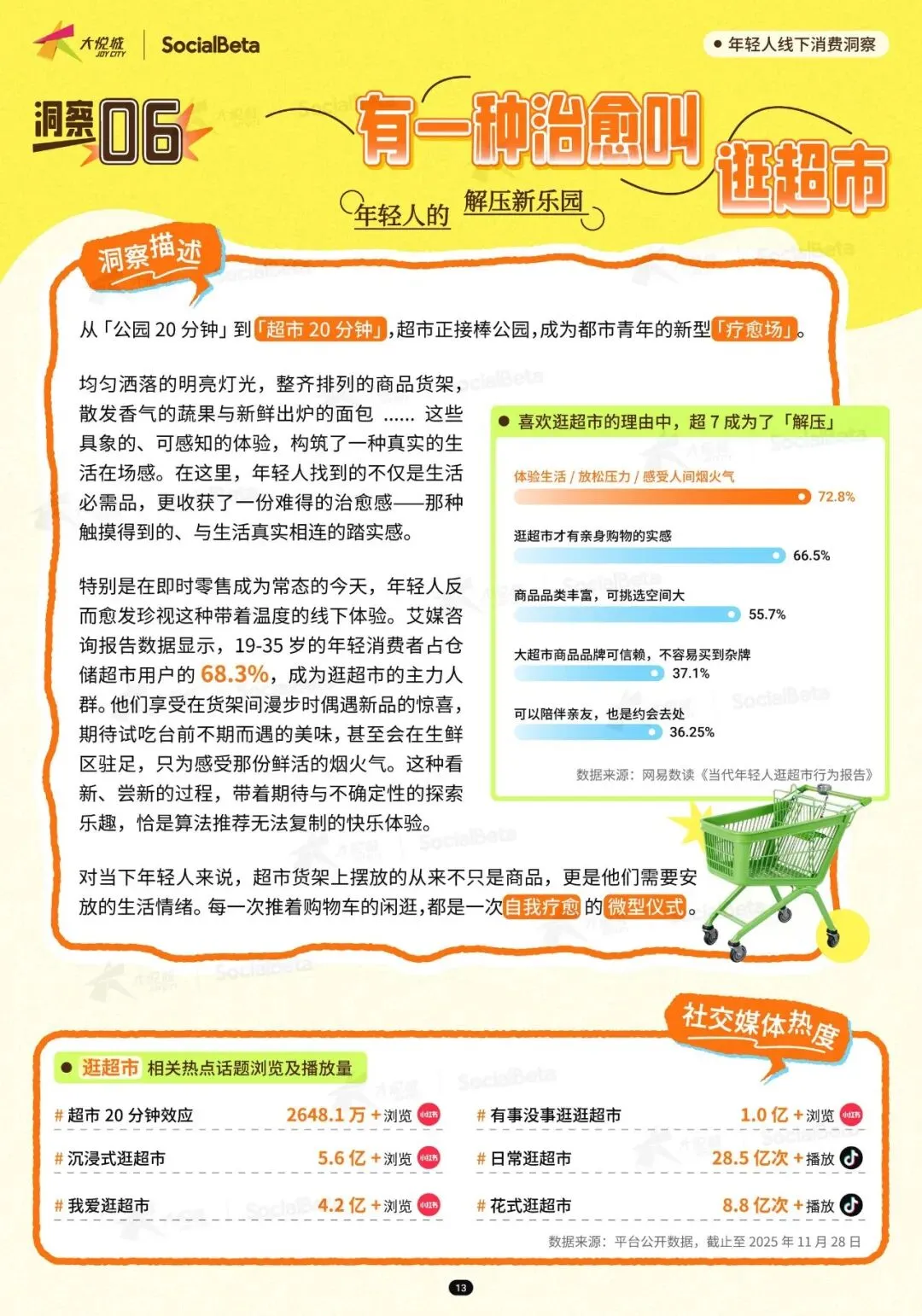 逛超市成为年轻人的 “治愈方式” 之一。数据显示,超市用户中 35 岁以下年轻人占比达 68.3%,他们享受在货架间漫步偶遇新品的惊喜,这种算法推荐无法复制的快乐,让超市成为重要的线下社交场景,37.1% 的年轻人会与亲友一起逛超市,36.25% 的人将其视为约会去处。