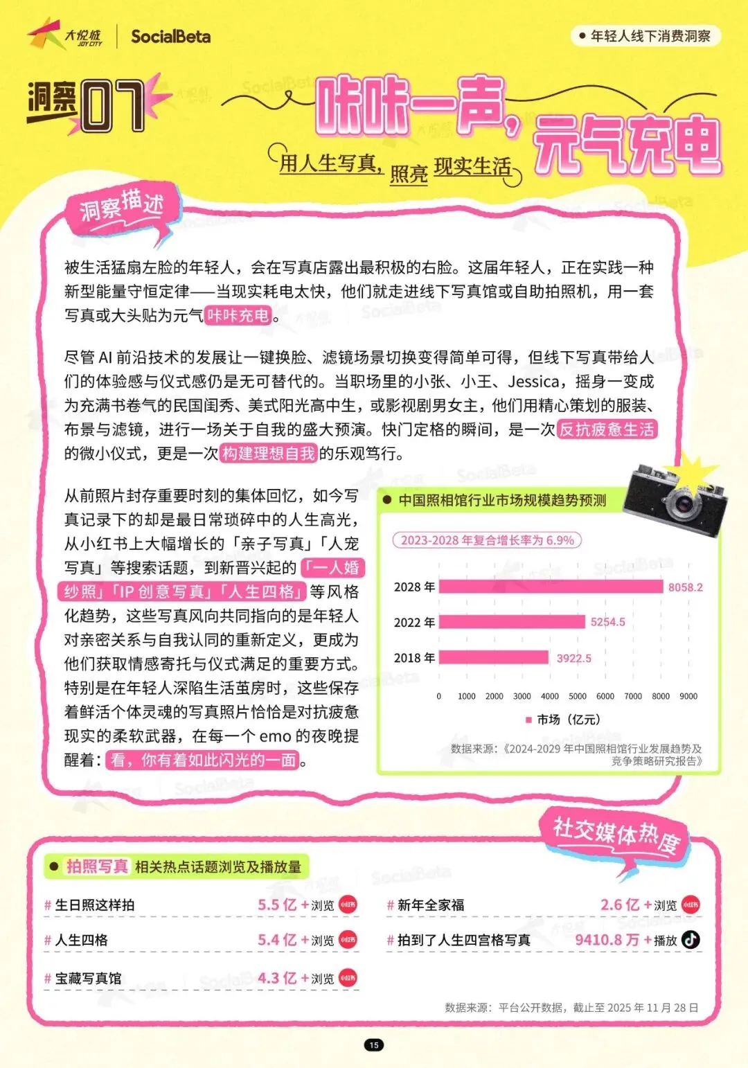 写真拍摄成为年轻人记录生活、获取情感寄托的重要方式。小红书上 “亲子写真”“人宠写真” 等搜索话题大幅增长,相关浏览量达 2.6 亿 +,播放量超 4.3 亿 +。年轻人对拍摄风格的要求精准明确,民国风、亲子风等特色写真备受喜欢。