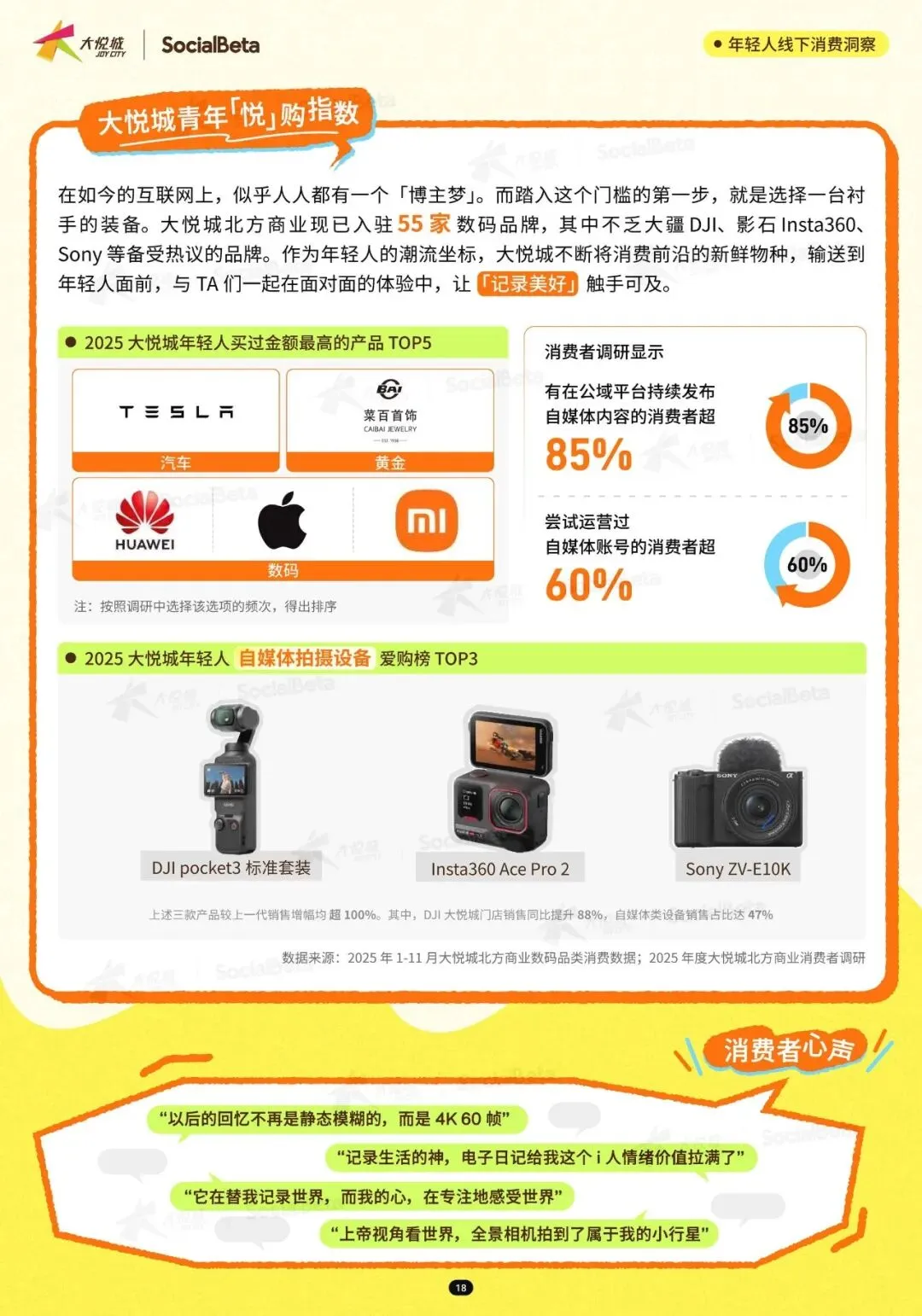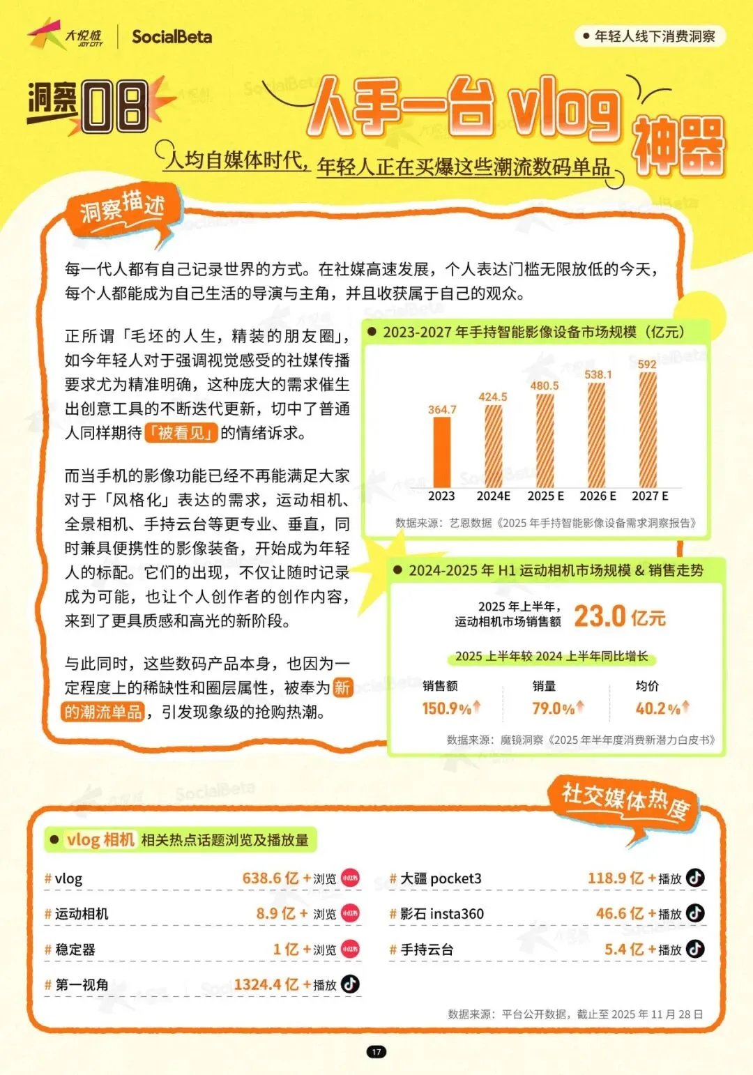 自媒体拍摄设备成为年轻人的 “标配”。随着记录生活、分享日常的需求增加,兼具便携性与功能性的影像装备持续热销。2025 年上半年,运动相机市场规模稳步增长,自媒体类设备销售占比达 47%。年轻人用这些设备记录世界、表达自我,“记录世界,我值拉满了” 成为他们的消费宣言。这类设备的流行,不仅让随时记录成为可能,更凭借一定的稀缺性和圈层属性,成为年轻人的潮流象征。