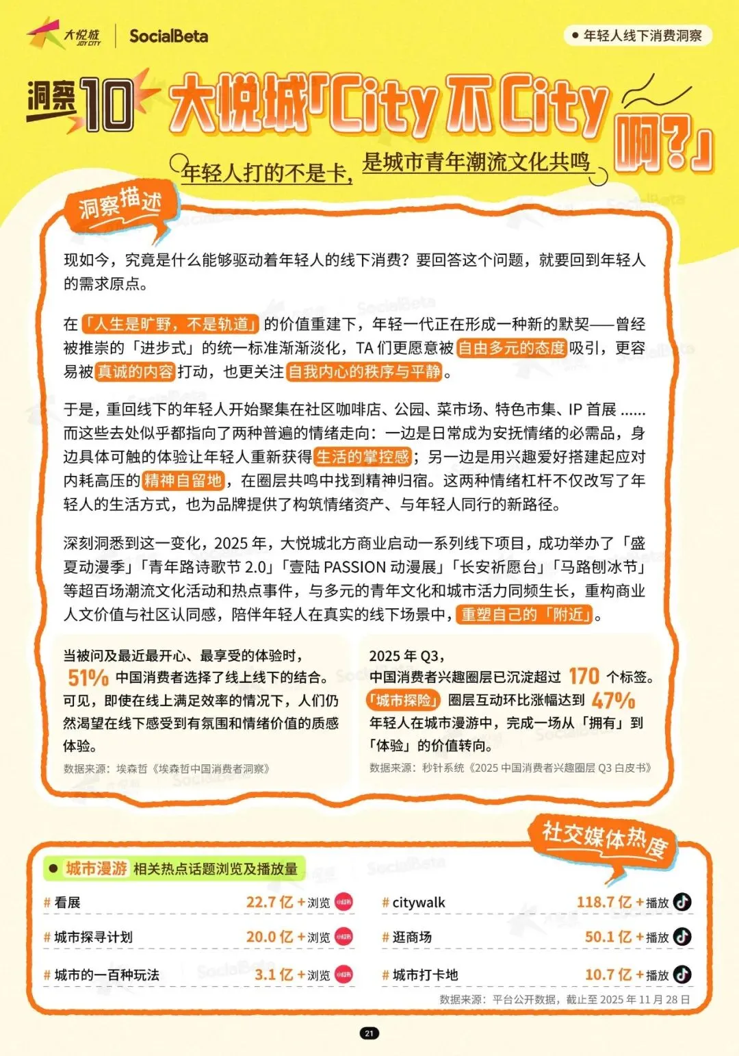 主题活动成为年轻人线下社交的重要载体。2025 年,相关话题播放量达 118.7 亿 +,浏览量超 3.1 亿 +,“城市探险”“城市的一百种玩法” 成为年轻人的热门社交话题。这些活动打破了传统商场的消费场景,为年轻人提供了自由张扬的表达空间,也让商场成为兼具购物、社交、体验功能的 “城市文化地标”。
