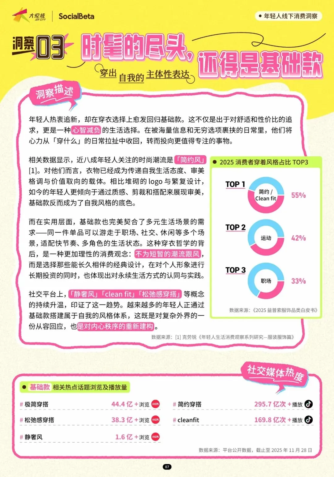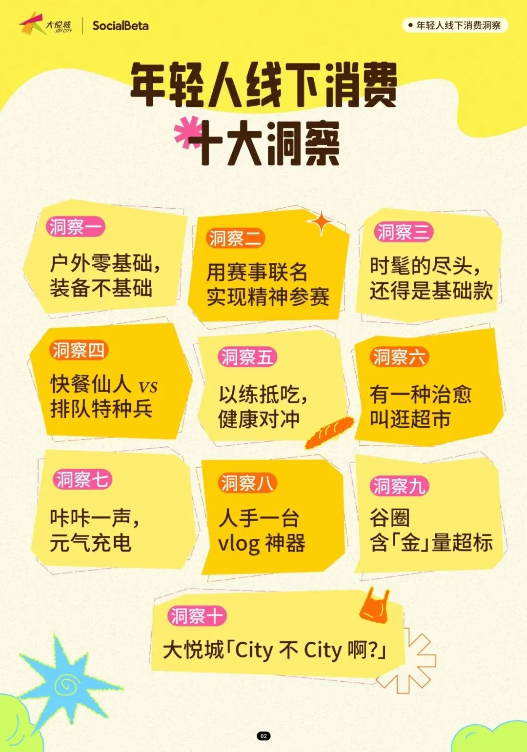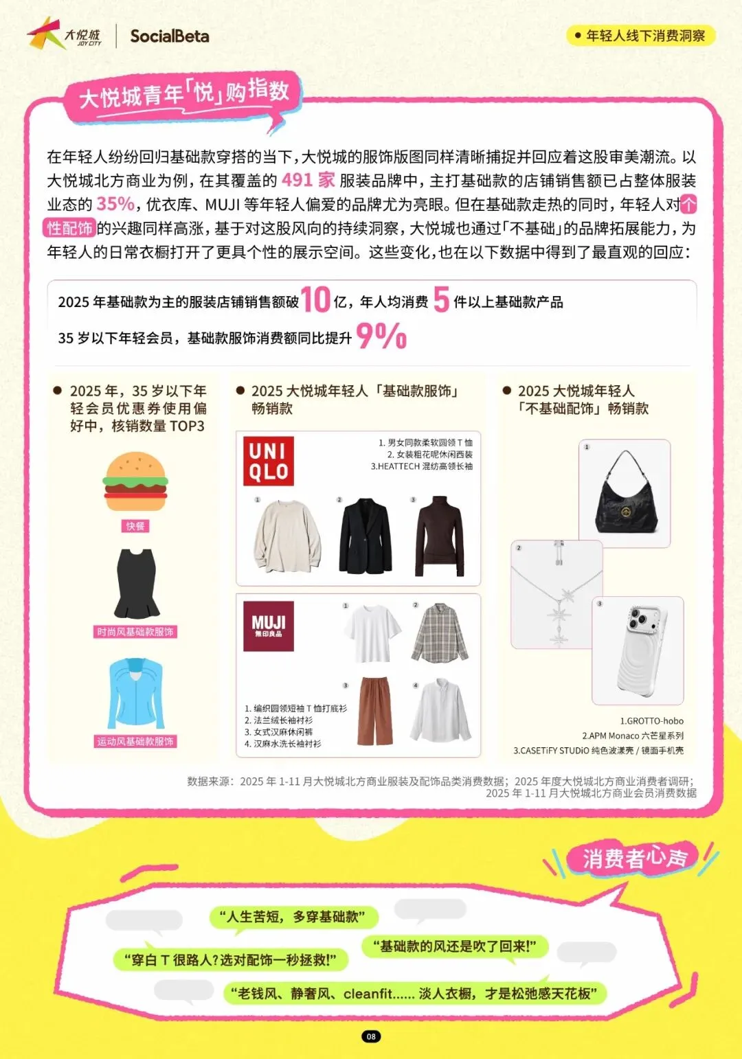 这份《2025年轻人线下消费洞察》报告由SocialBeta与大悦城基于北方区域商业数据联合发布,呈现出一幅当代青年在实体空间中重构生活意义的生动图景。以下是对这份报告的深度解读:报告揭示了年轻人线下消费的根本性转变——消费不再是简单的物质获取,而是成为对抗数字倦怠、建立身份认同、实现情感疗愈的主动选择。当线上世界带来信息过载与社交疲惫,实体空间反而成为年轻人重建内心支点的"现充"(现实充实)圣地。这种转变催生出三大底层逻辑:装备先行的生活方式预演、圈层身份的文化符号消费、以及即时疗愈的日常仪式构建。即使深陷"时间贫困"无法频繁奔赴山海,年轻人仍愿为专业户外装备支付溢价。2025年数据显示,35岁以下会员在户外运动产品上的销售额同比提升超过52%,冲锋衣、速干裤、机能鞋等单品客单价高达1800元以上,远超普通运动品类92%。这种"差生文具多"现象的本质,是通过消费构建理想的户外身份——在通勤OOTD中融入山系穿搭,用防风面料和机能美学为日常注入松弛感。小红书#山系穿搭话题浏览量突破5.7亿次,印证了这一风格已从专业圈层渗透为大众审美。年轻人购买的不仅是功能,更是"满级顶配"带来的安全感和对抗都市焦虑的心理铠甲。当身体无法抵达赛场,钱包可以。2025年上半年,重点赛事直接带动消费超160亿元,而年轻人通过购买adidas×北马联名跑鞋、LPL联名键鼠、中网联名咖啡,获得一张"圈层身份证"。这种消费行为将体育的稀缺性与社交货币属性完美结合——adidas ADIZERO ADIOS PRO4跑鞋成为大悦城热销爆款,赛事联名款售罄率普遍超过59%,发售当月店铺客流同比增幅均值达15%。数据显示,65%的联名商品发售当月即告售罄,带动整体销售增幅超65%。年轻人购买的不仅是商品,更是站上起跑线的想象、峡谷驰骋的代入感,以及"优雅观赛"的身份标签。在28.5亿次播放的#简约穿搭话题背后,是年轻人对"穿什么"的日常决策疲劳的反抗。近八成年轻人选择简约风格,优衣库、MUJI等基础款品牌在大悦城的销售额占比已达服装业态的35%。这种回归并非审美降级,而是主体性觉醒——35岁以下会员基础款服饰消费额同比提升9%,人均年购买超5件。年轻人通过质感、剪裁而非logo来展现审美,一件法兰绒衬衫可游走于职场、社交、休闲多场景,实现"心智减负"。基础款成为自我风格的底色,体现了从跟风消费到长期主义投资品的认知升级。工作日化身"快餐仙人",靠米村拌饭、Burger King一键回血,追求决策零负担;周末变"排队特种兵",为烤匠、费大厨辣椒炒肉甘愿苦等数小时,将美食体验转化为社交勋章。超七成打工人每周必吃快餐,而网红餐厅打卡率以18.6%成为尝鲜首选。数据显示,网红餐饮在大悦城门店的销售同比增幅远超快餐品类,年轻人排的不是队,是朋友圈九宫格的C位,是"氛围感拉满"的情绪价值。这种精分本质上是精力管理学——工作日开启"心力节能模式",周末则全情投入生活仪式。后浪研究所数据显示,年轻人周均健身3.3次,单次1.3小时,妥妥的生活标配。但超九成健身者并不严格控制饮食,而是践行"赴GYM请罪"哲学——先放纵享受火锅烧烤的社交愉悦,再通过运动抵消"热量负债"。大悦城数据印证了这一循环:86家健身门店会员运动后,最常消费的TOP3品类正是火锅、烧烤和精酿,核销礼金券占比超90%。这种不极端、不内耗的态度,将健康与享乐转化为可持续的动态平衡,"锻炼是为了更好地吃"成为主流心声。从"公园20分钟"到"超市20分钟",仓储超市中68.3%的用户是19-35岁年轻人。在大悦城,35岁以下会员贡献了超市客单价的96%溢价,客单价达360元以上,同比提升73%。推着购物车漫步货架间,试吃新品、触摸新鲜蔬果、沉浸于烟火气,这种"可触摸的真实"对抗着算法推荐的虚拟感。数据显示,51%的超市消费会员年龄在35岁以下,盒马鲜生开业首日客流突破2.1万人次。超市不再是采购场所,而是"把快乐一件件装进购物车"的自我疗愈仪式。当AI换脸技术泛滥,线下写真的仪式感和体验感更显珍贵。2025年照相馆市场规模预计突破8000亿元,大悦城18家摄影店铺客单价已达820元,接近服装品类。年轻人热衷于"人生四格"、单人婚纱照、宠物合拍等新形式,将拍照转化为对抗疲惫的"元气充电"。快门按下瞬间,职场Jessica变身影视剧主角,这是构建理想自我的乐观笃行。74%的消费者购买过摄影服务,IP联名系列成为新晋热门。写真从记录集体回忆转向捕捉个体高光,存放的是对抗emo现实的柔软武器。当手机影像无法满足风格化需求,DJI Pocket3、Insta360 Ace Pro 2、Sony ZV-E10K等手持设备成为年轻人标配。2025年上半年运动相机市场规模23亿元,同比增长150.9%,其中DJI大悦城门店销售同比提升88%。60%的消费者尝试过自媒体运营,85%在公域平台持续发布内容。这些设备不仅是工具,更是"替我记录世界"的感官延伸,让回忆以"4K 60帧"的质感保存。年轻人愿意为创作自由支付溢价,现象级抢购揭示出"人均自媒体时代"的创作民主化。当"万物皆可痛"的风吹到黄金,IP联名金饰(痛金)成交额同比增长294%,18-24岁金饰拥有率较2019年几乎翻倍。老凤祥×圣斗士星矢、潮宏基×线条小狗、周大福×迪士尼公主系列成为爆款。56.2%的泛二次元用户购买周边,84%愿为限量款支付溢价。年轻人买的不是金子克重,而是"给青春上了个户口"的情感确权。黄金从保值投资品转变为"最贵周边",既满足I