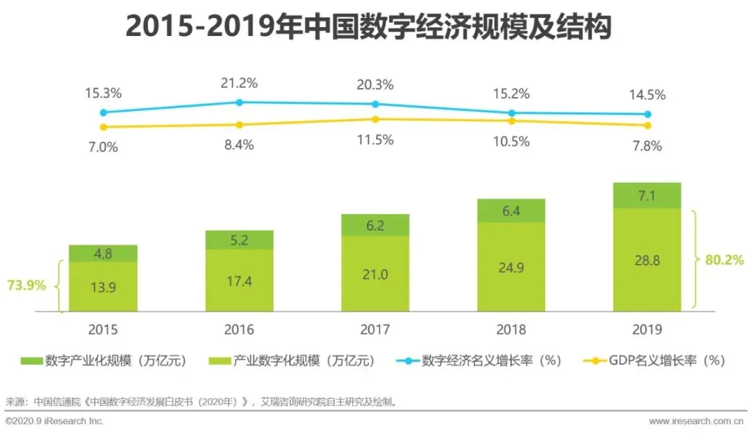 2019年中国数字经济规模达到35.8万亿元,同比名义增长率相比GDP高出6.7%。在经济下行压力加大、外部环境复杂叠加疫情冲击的特殊时期,围绕数字经济开展新一轮科技革命与产业变革,无疑是引领经济内生动力增长、结构优化的关键。产业数字化规模占比由2015年的13.9增长至80.2%,在数字技术与实体经济加速融合的过程中,第三产业数字经济渗透最为领先,2019年服务业数字经济增加值占行业增加值比重已经达到37.8%,数字化转型升级前景持续看好。
